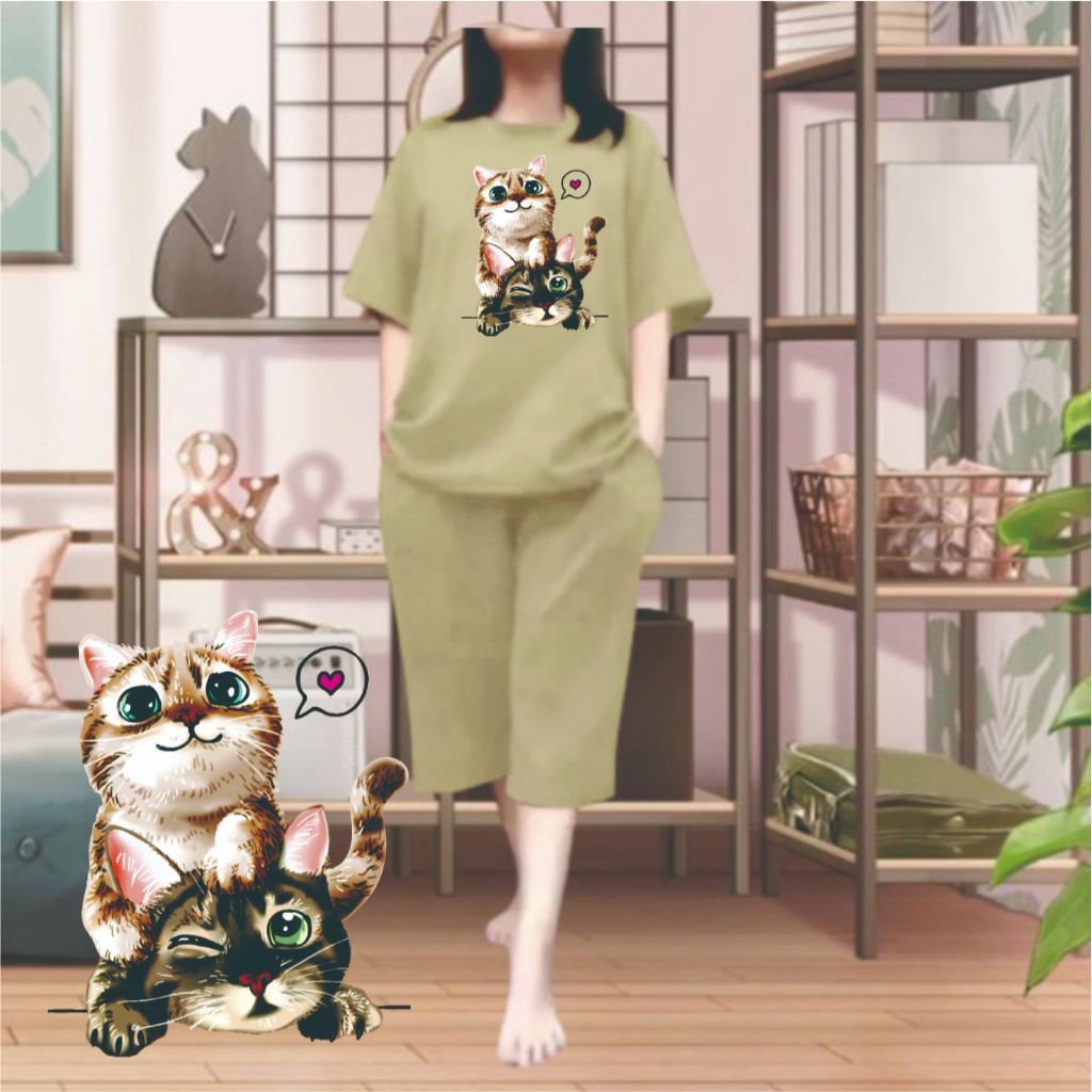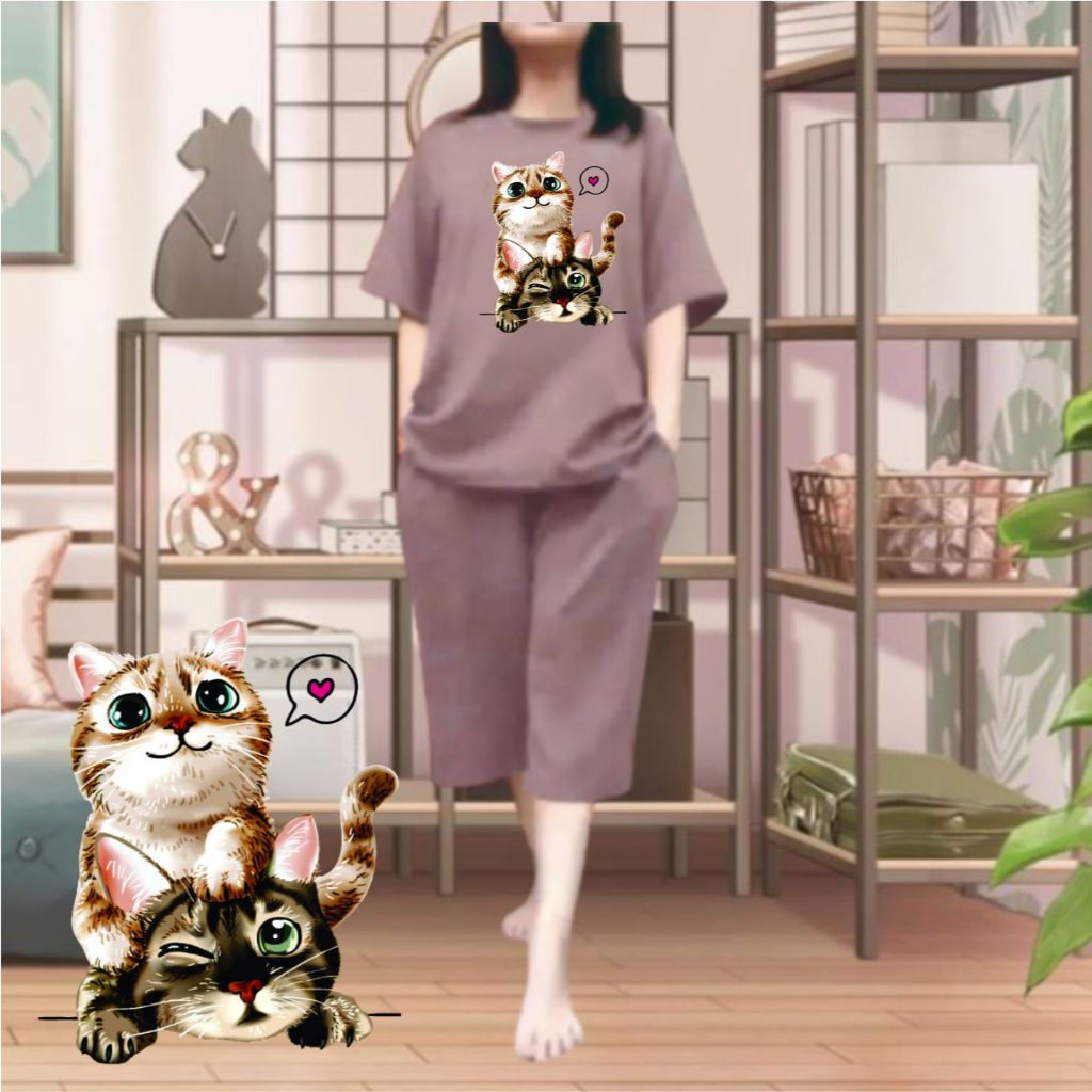 Setelan kulot 3/4 jumbo wanita D3W4SA motif kucing