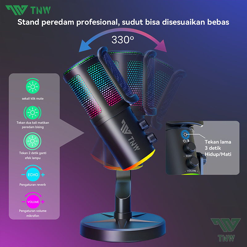 Tnw K20 Wireless Microphone Condenser Usb Type-C Mikrofon With Rgb Light Untuk Pc Streaming&Gaming