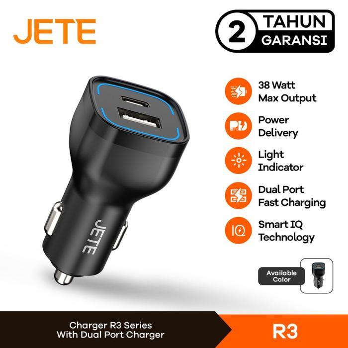 PALING DICARI ! JETE R3 CHARGER MOBIL | CAR CHARGER DUAL OUTPUT USB & TYPE-C PD 38W GARANSI 2 TAHUN - HITAM TERMURAH