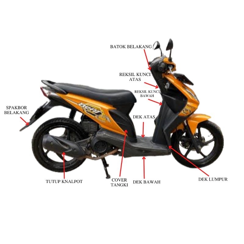 Batok Belakang, Reksil Kunci Atas, Reksil Kunci Bawah, Dek Lumpur, Dek Atas, Dek Bawah, Cover Tangki, Spakbor Belakang, Tutup Knalpot, Batok Blk Reksil Ats