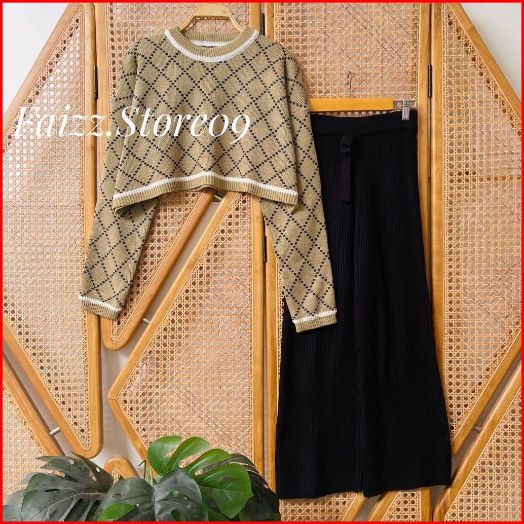 Oneset Eliana Sweater Rajut Motif Sido Kotak Setelan Celana Kulot Premium Wanita Lengan Panjang Kekinian