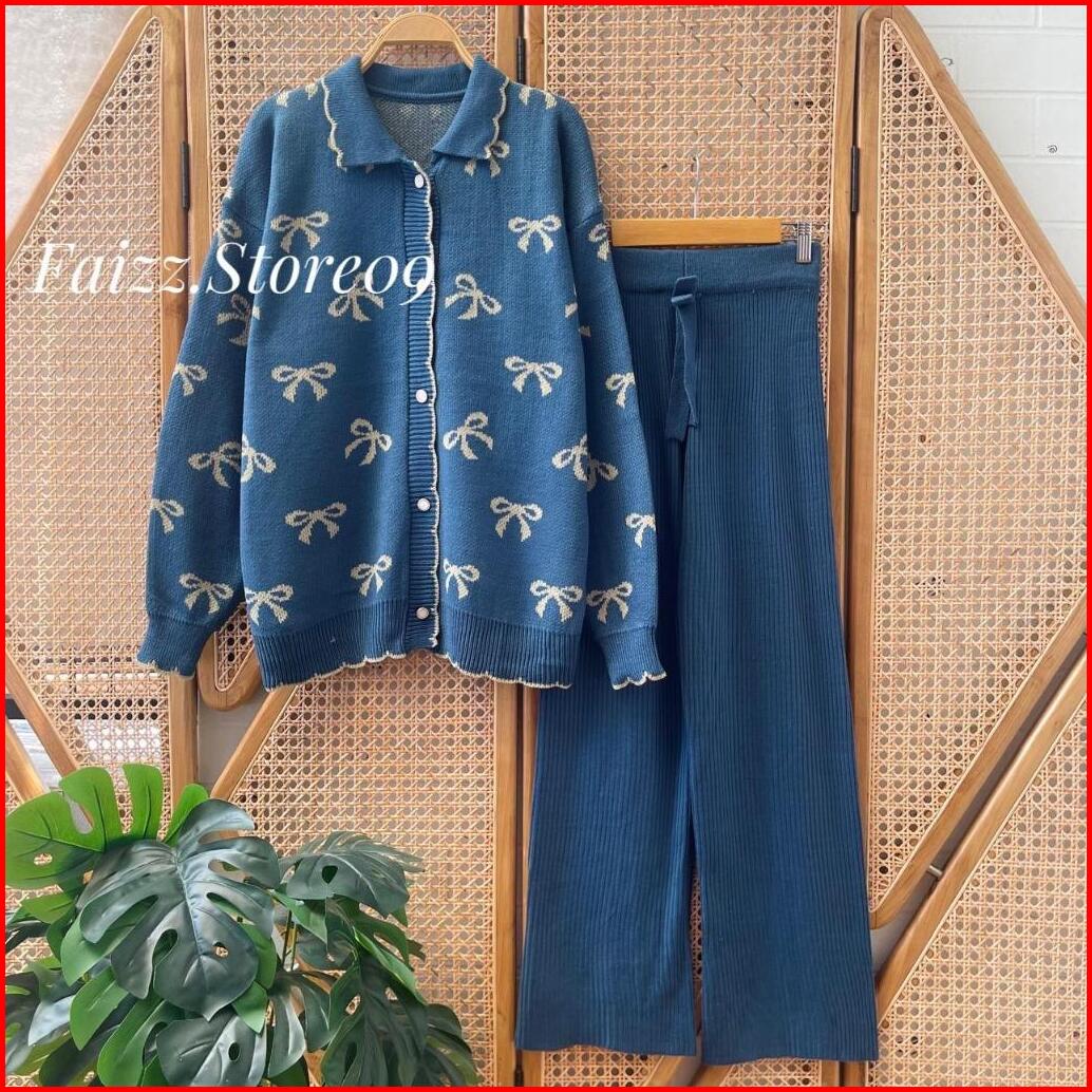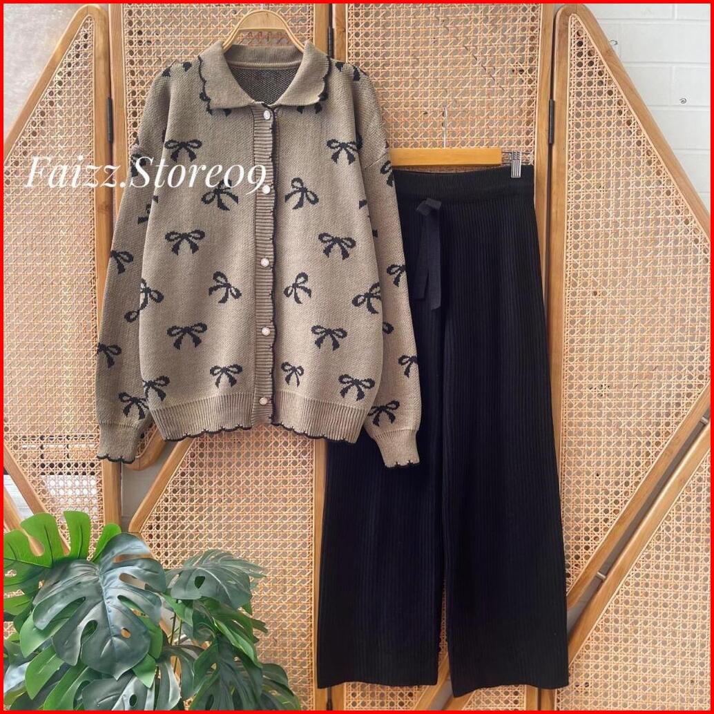 Oneset Poppy Cardigan Rajut Berkerah Motif Pita Setelan Celana Kulot Premium Wanita Lengan Panjang Kekinian