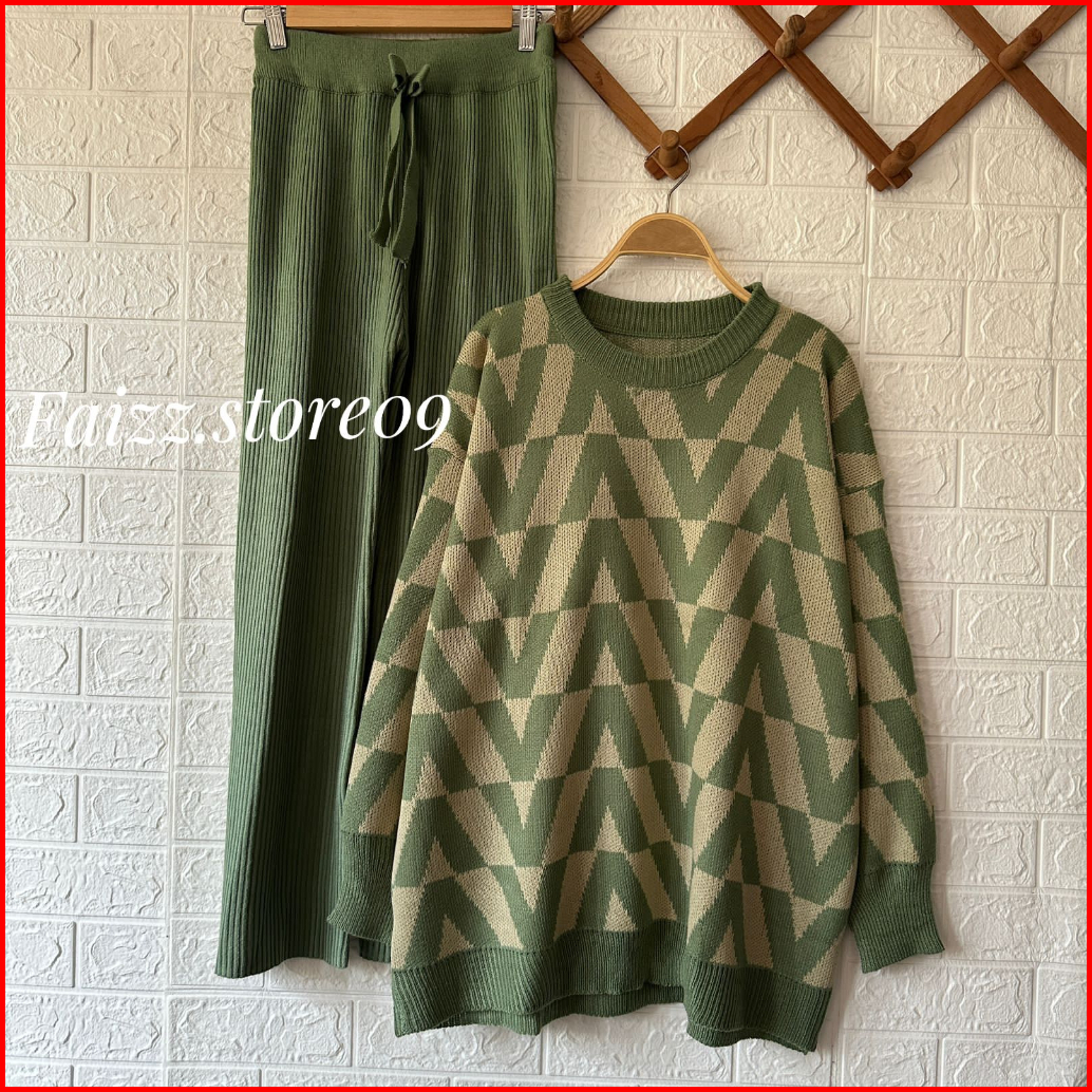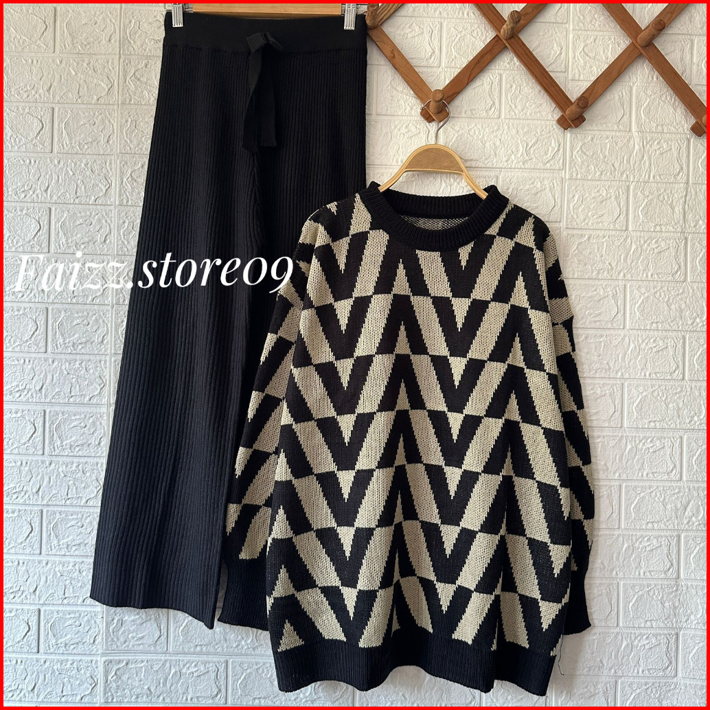 Oneset A55 Giva Knit Sweater Oversize Setelan Celana Kulot Rajut Wanita