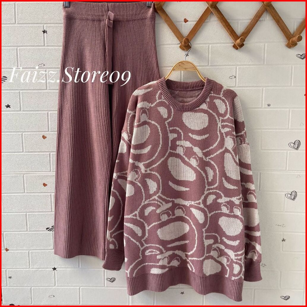 Oneset Sweater Rajut Aramun Motif Bernard Setelan Celana Kulot Premium Wanita Kekinian