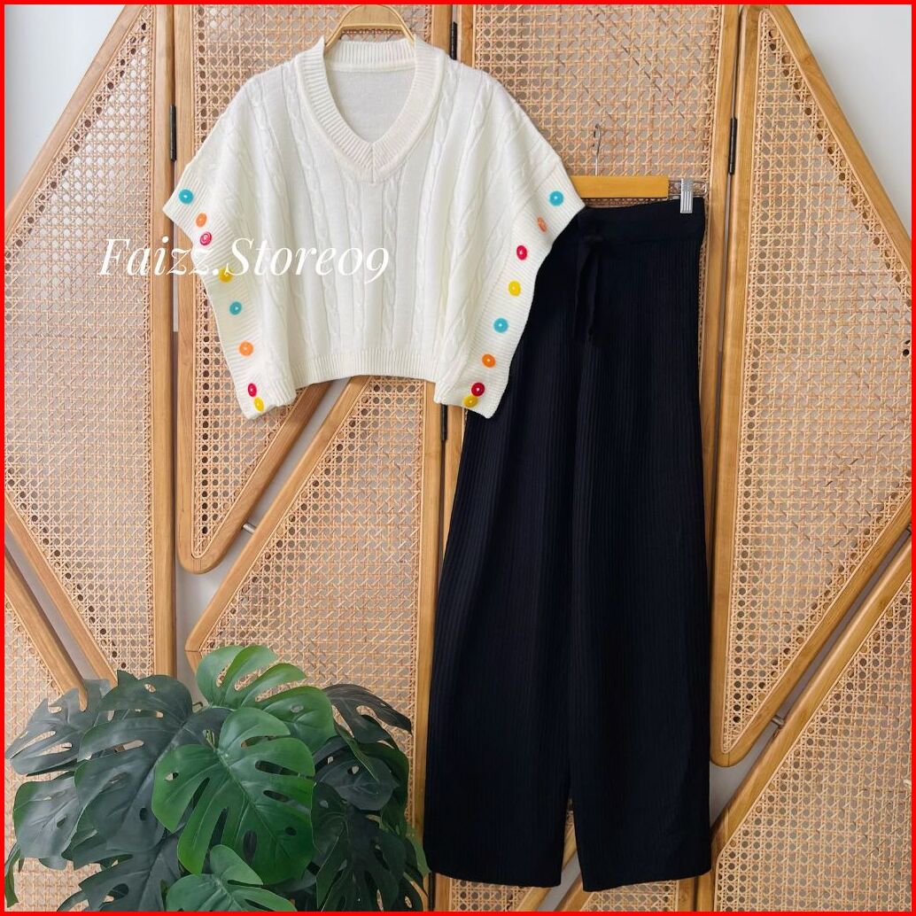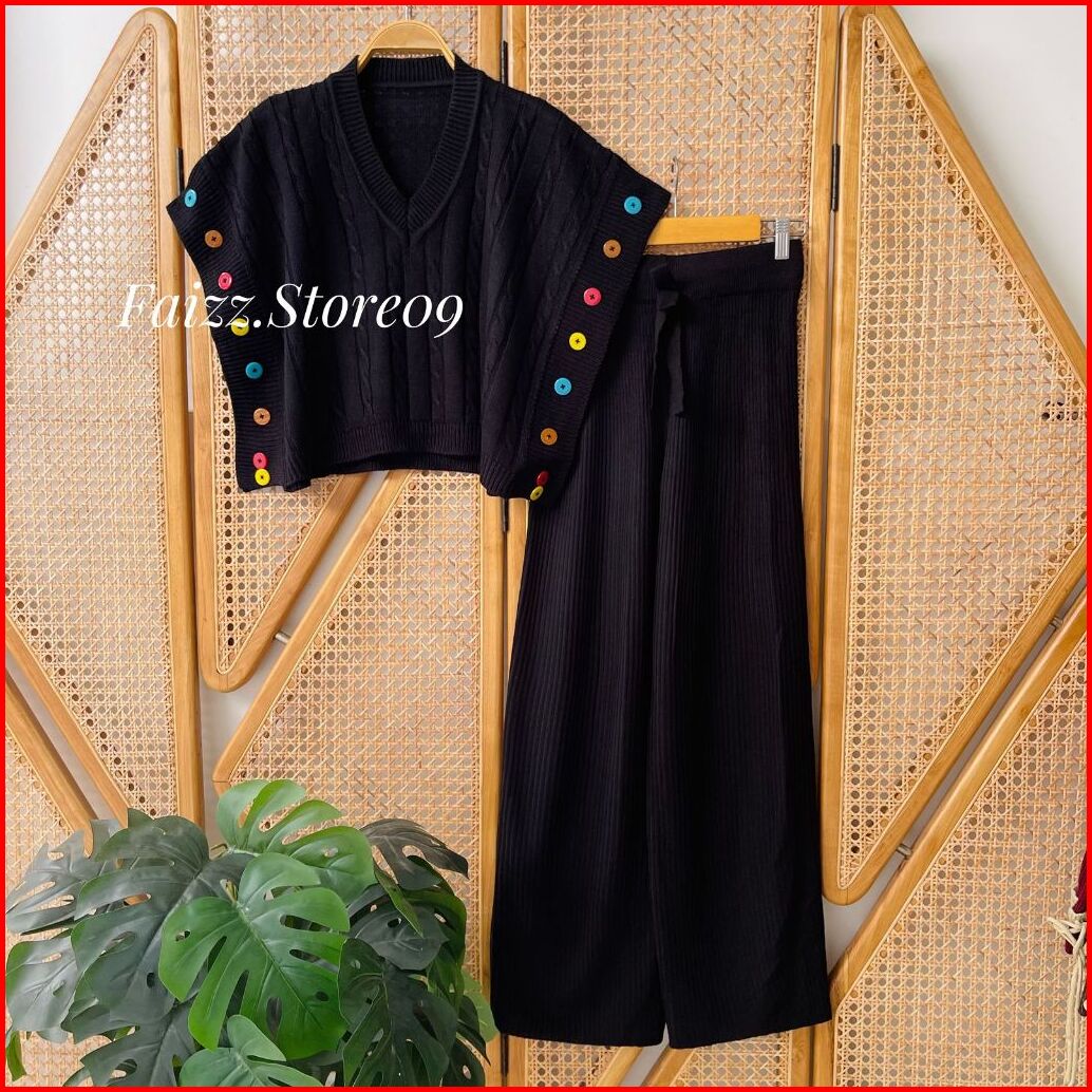 Oneset Wulan Vest Rompi Rajut Motif Cable Setelan Celana Kulot Premium Wanita Kekinian