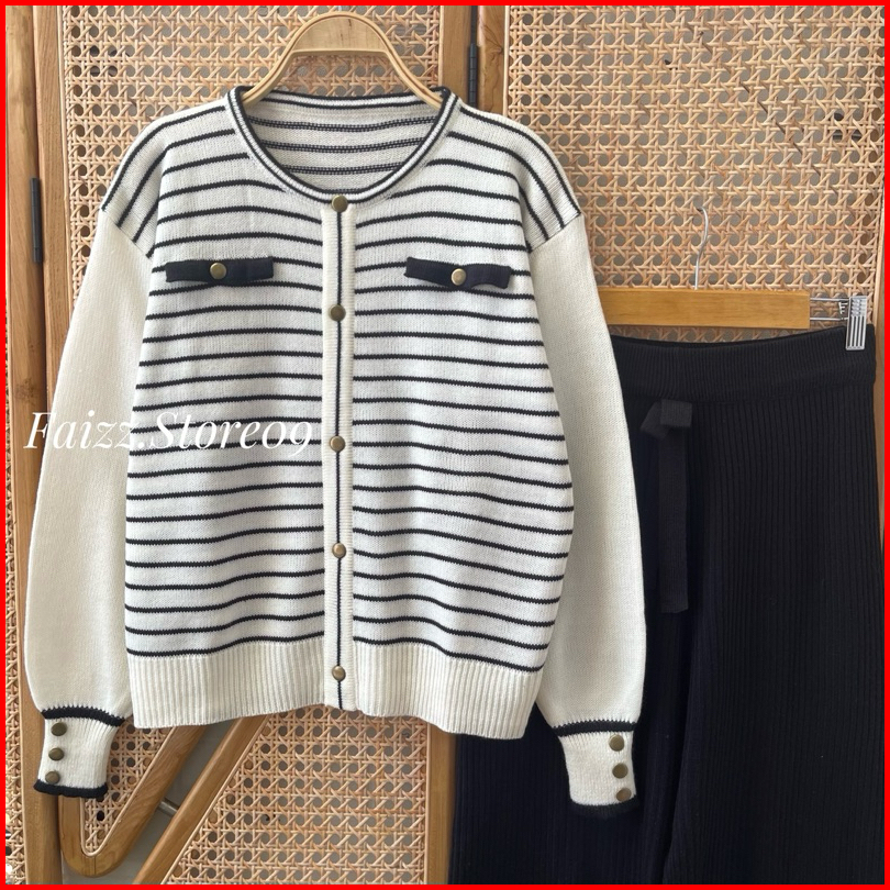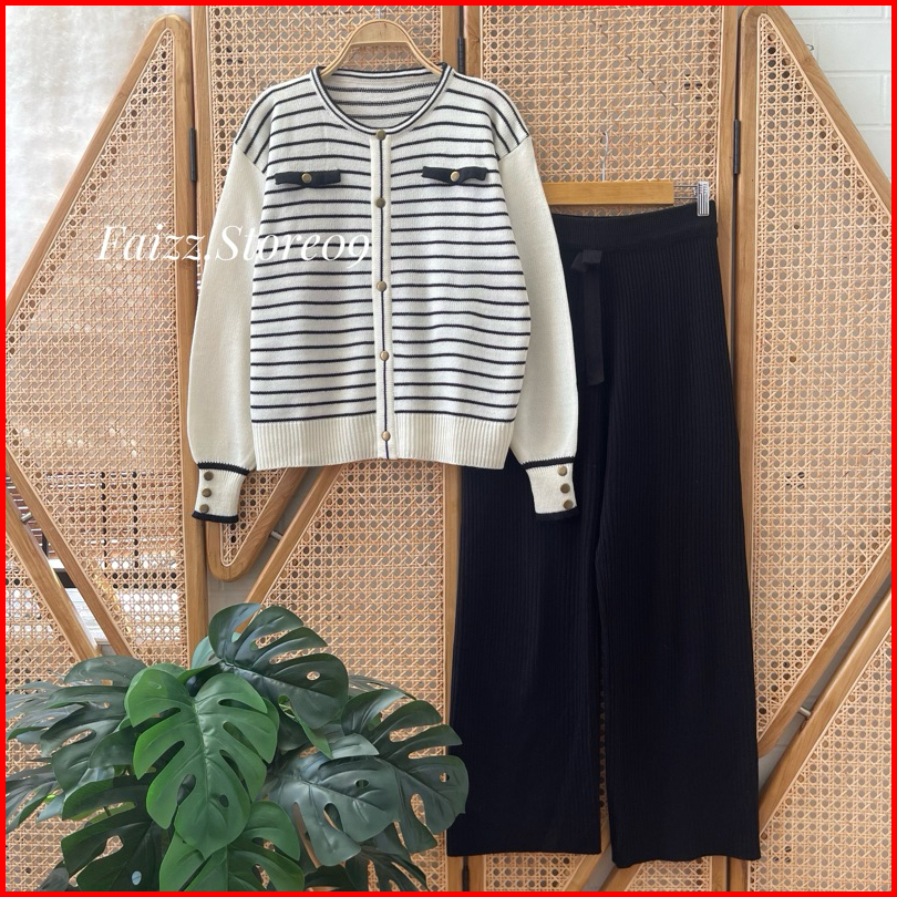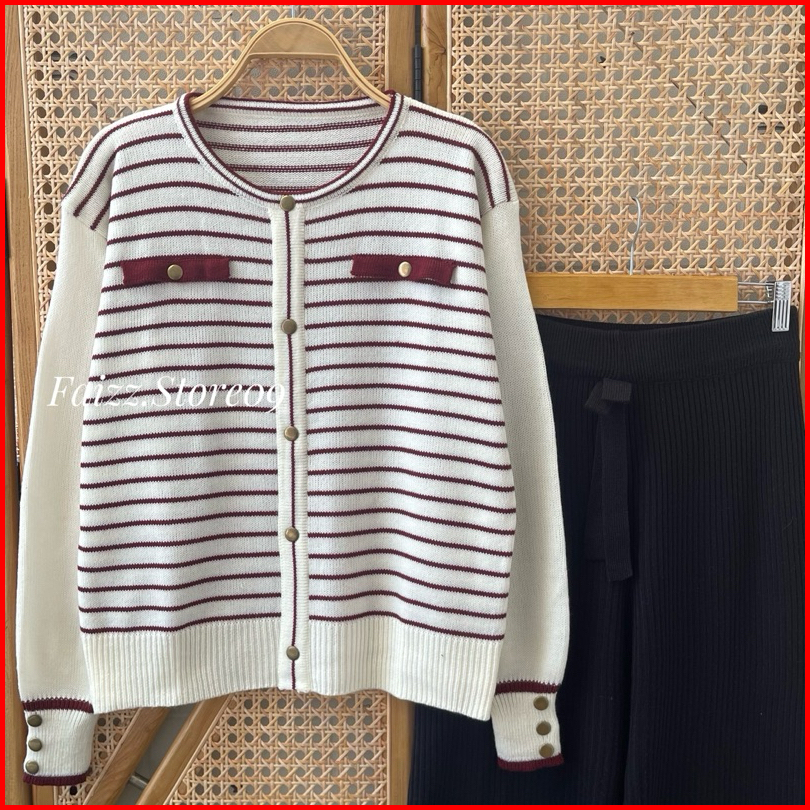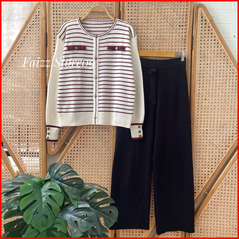Oneset Sarwendah Sweater Rajut Motif Kancing Stripe Setelan Celana Kulot Premium Wanita Lengan Panjang Kekinian
