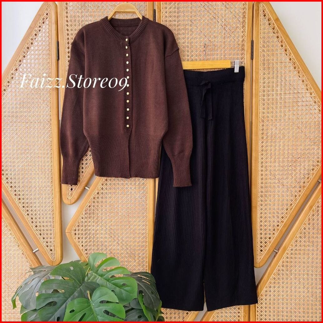 Oneset Maria Cardigan Rajut Kancing Setelan Celana Kulot Premium Wanita Lengan Panjang Kekinian
