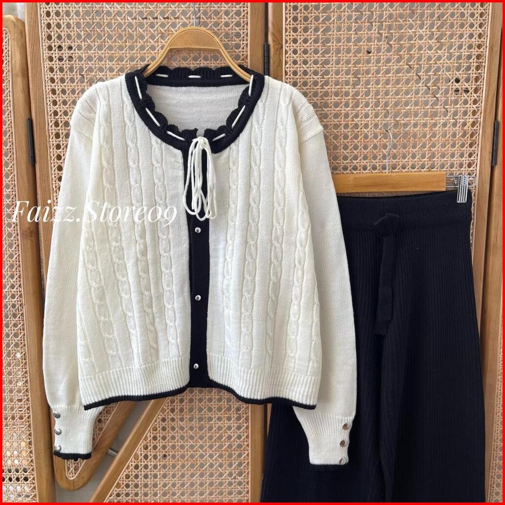 Oneset Vela Cardigan Rajut Tali Pita Motif Cable Setelan Celana Kulot Premium Lengan Panjang Wanita Kekinian