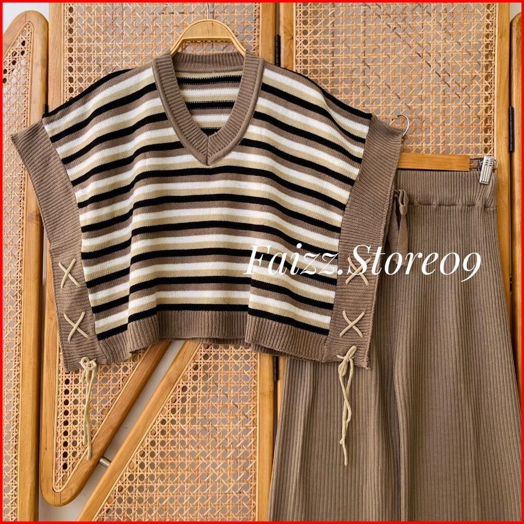 Oneset Floren Vest Rompi Rajut Motif Stripe Talikur Setelan Celana Kulot Premium Wanita Kekinian