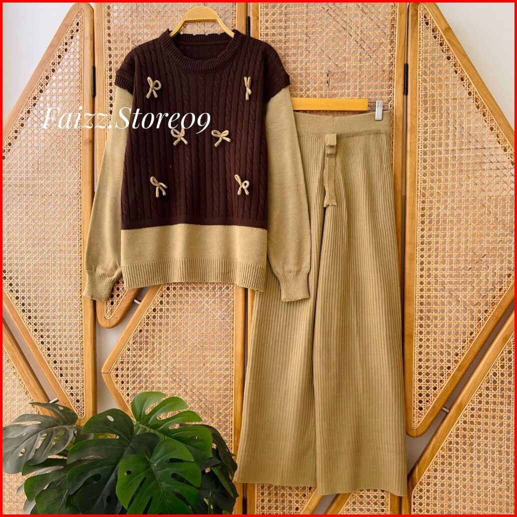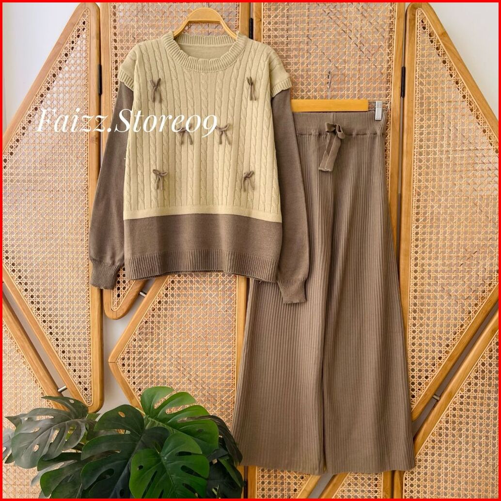Oneset Sierra Sweater Rajut Motif Pita Cable Setelan Celana Kulot Premium Wanita Lengan Panjang Kekinian