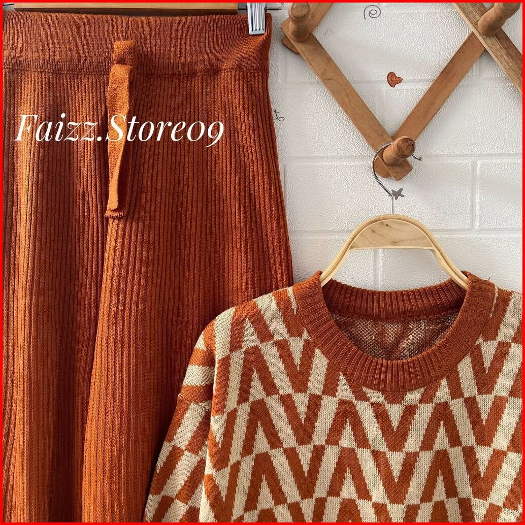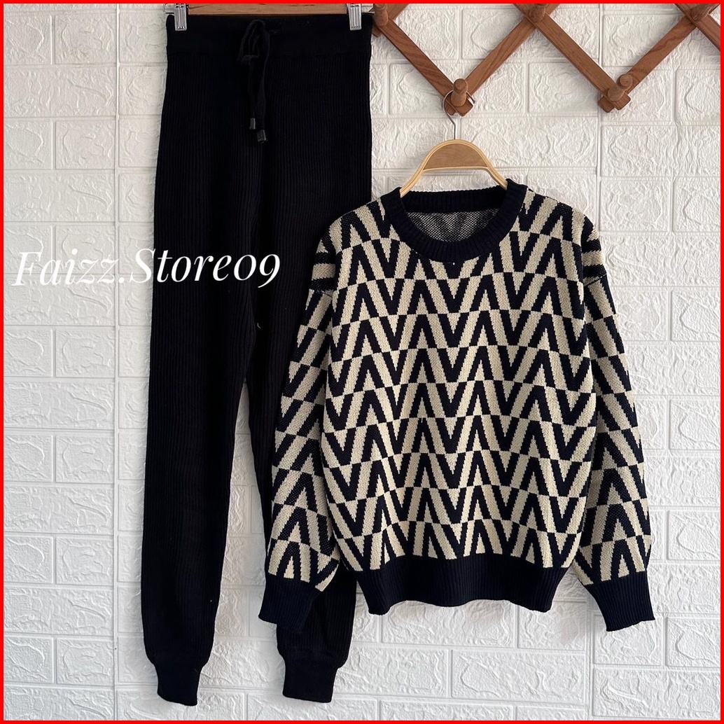 Oneset Giva Rajut Knist Import Motif V Setelan Celana Kulot Dan Joger