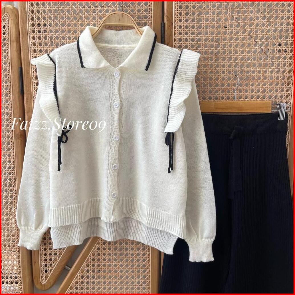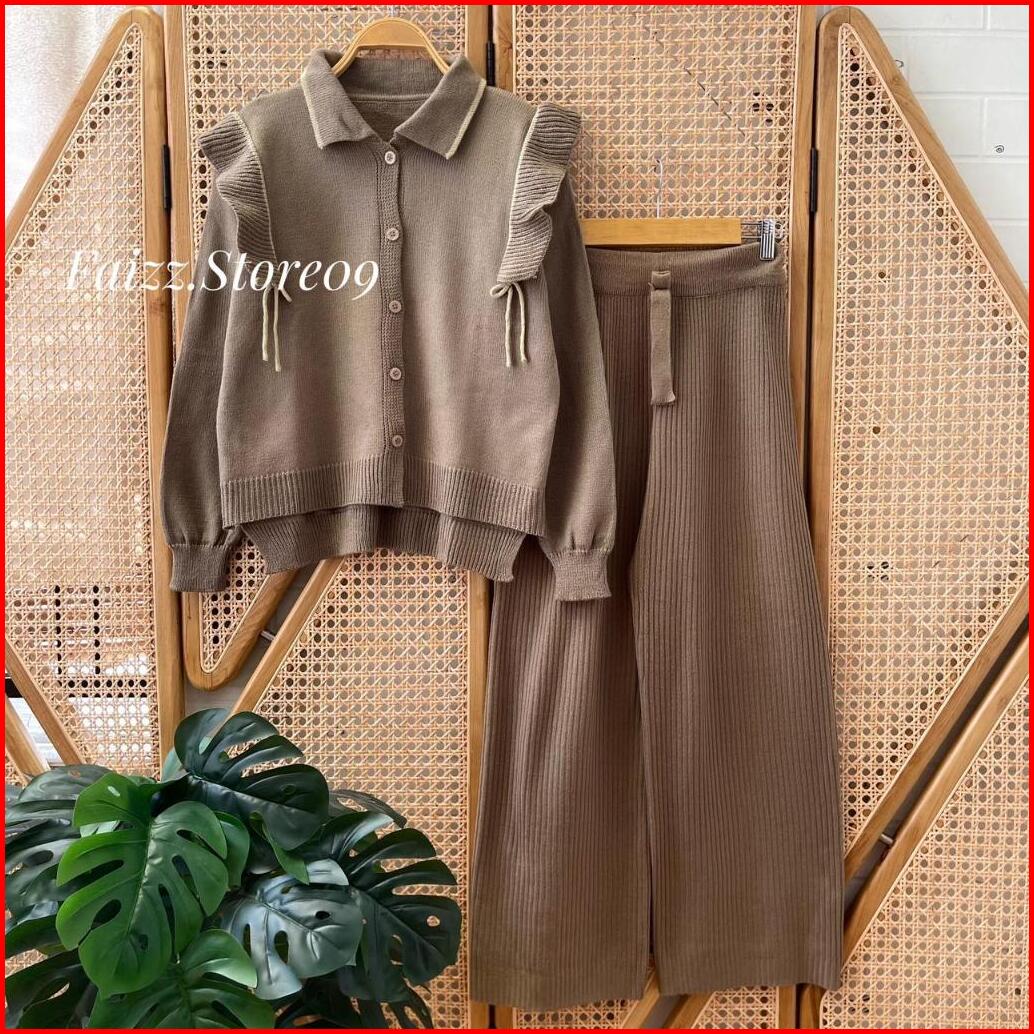 Oneset Alidah Cardigan Rajut Motif Polos Setelan Celana Kulot Premium Wanita Lengan Panjang Kekinian