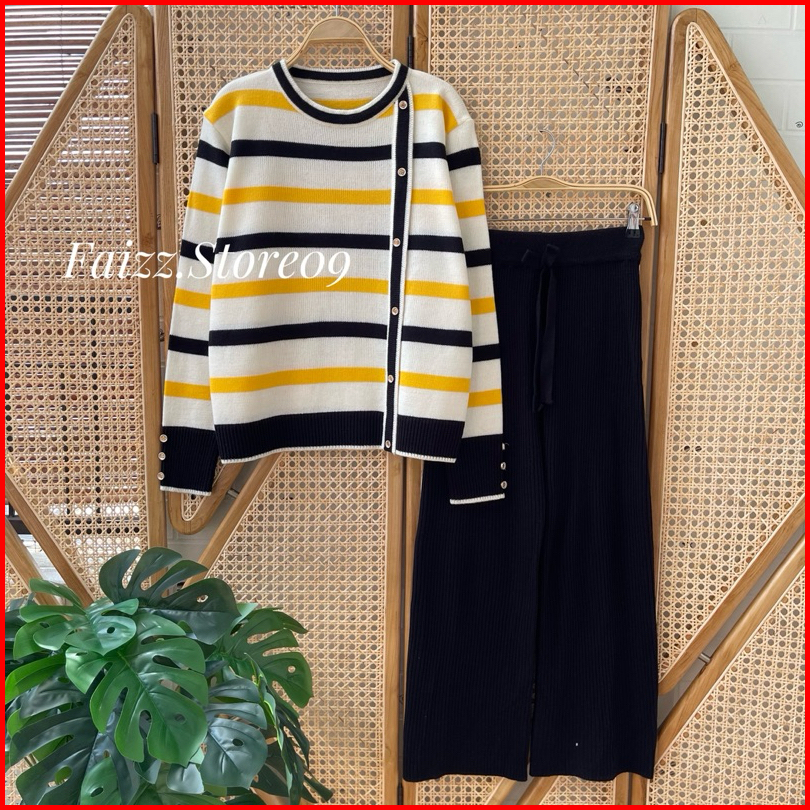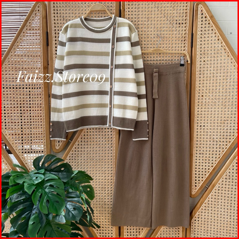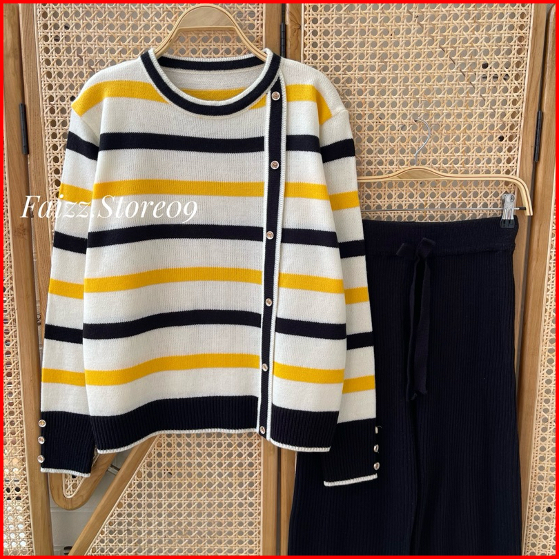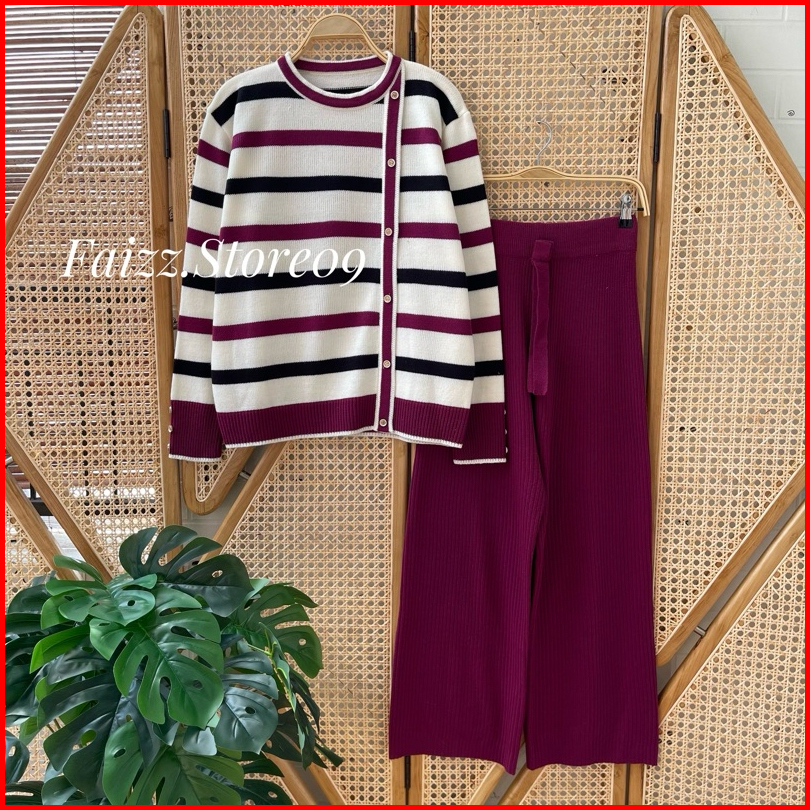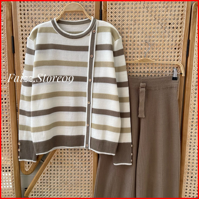 Oneset Delima Sweater Rajut Motif Stripe Setelan Celana Kulot Wanita Lengan Panjang Premium Kekinian