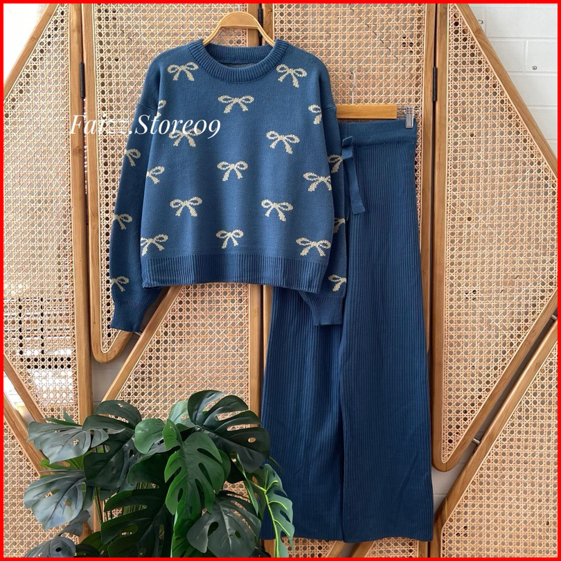 Oneset Amna Crop Top Knits Sweater Motif Pita Setelan Celana Kulot Rajut Premium Wanita Lengan Panjang Kekinian