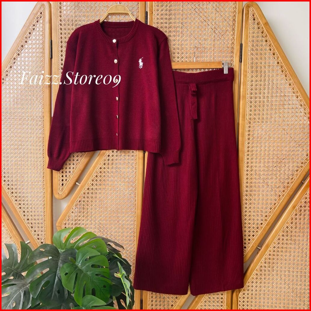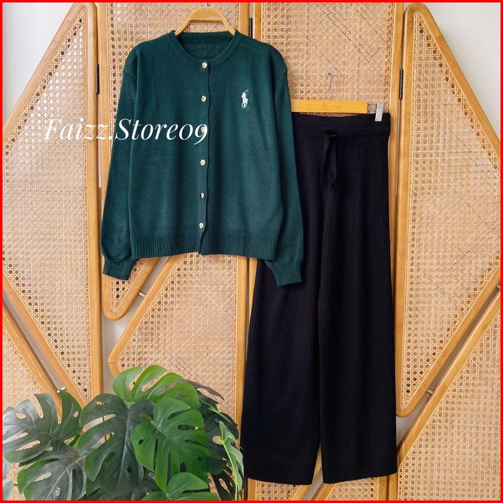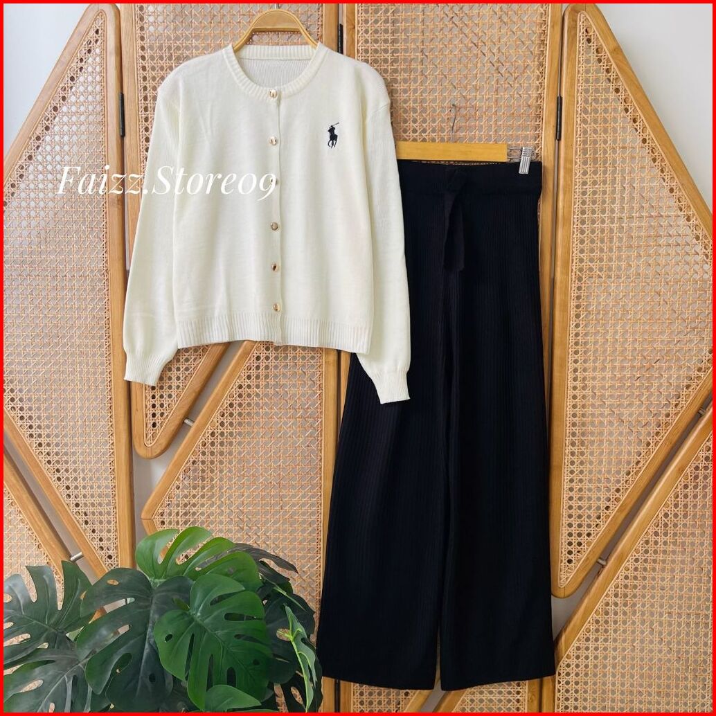 Oneset Nani Cardigan Rajut Kancing Polo Horse Motif Simple Setelan Celana Kulot Premium Wanita Lengan Panjang Kekinian