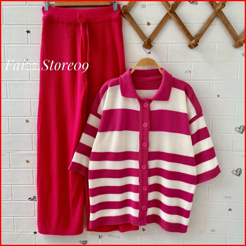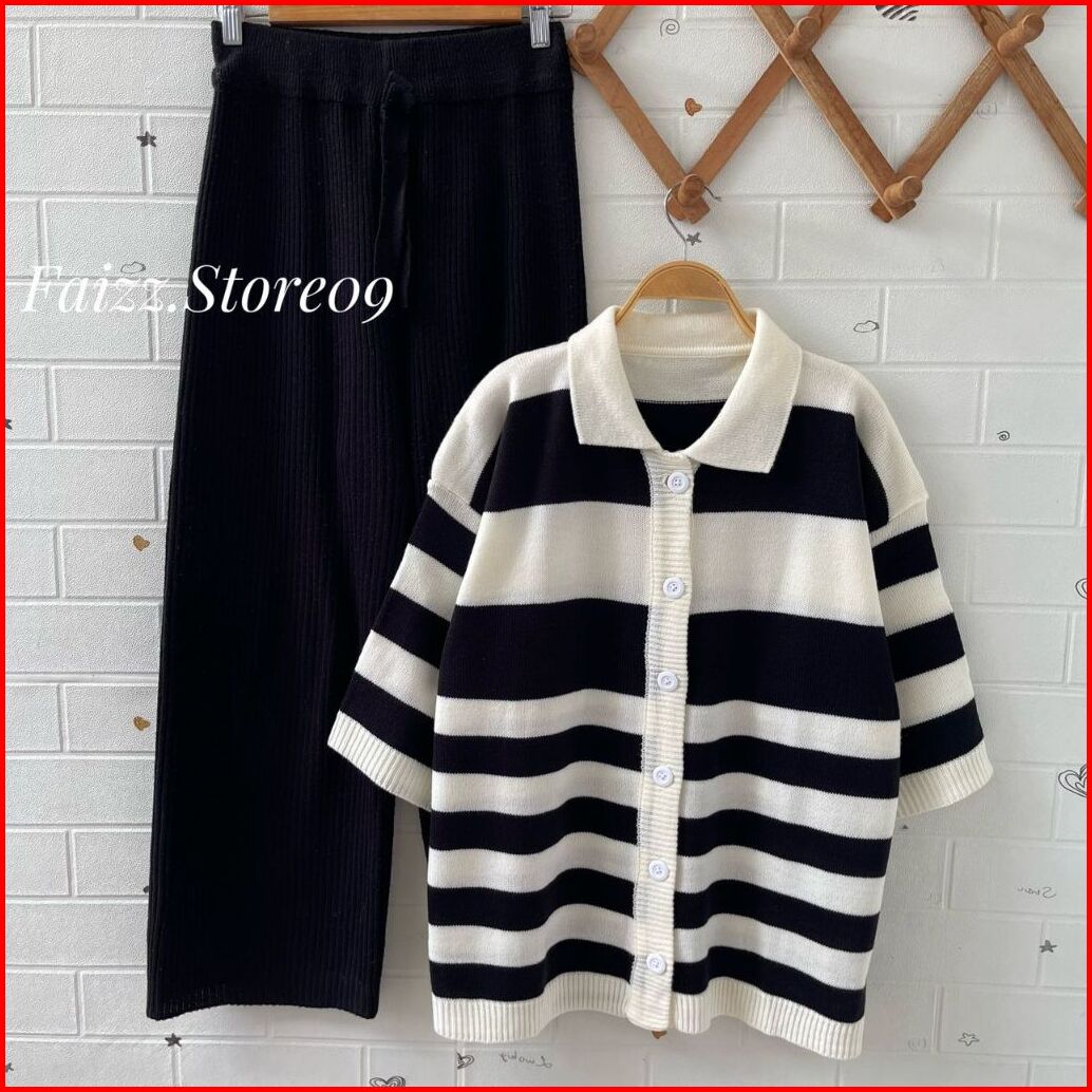 Oneset Shania Polo Cardy - Kardigan Rajut Kancing Motif Stripe Oversize Setelan Celana Kulot Rajut Premium Wanita Kekini