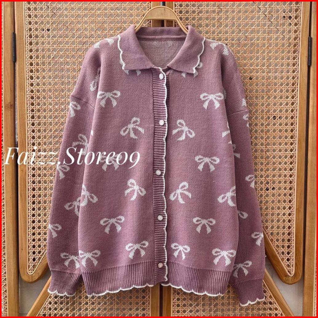 Poppy Outer Kancing - Cardigan Rajut Oversize Berkerah Motif Pita Atasan Korean Style Wanita Premium
