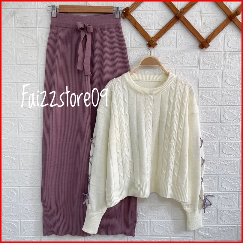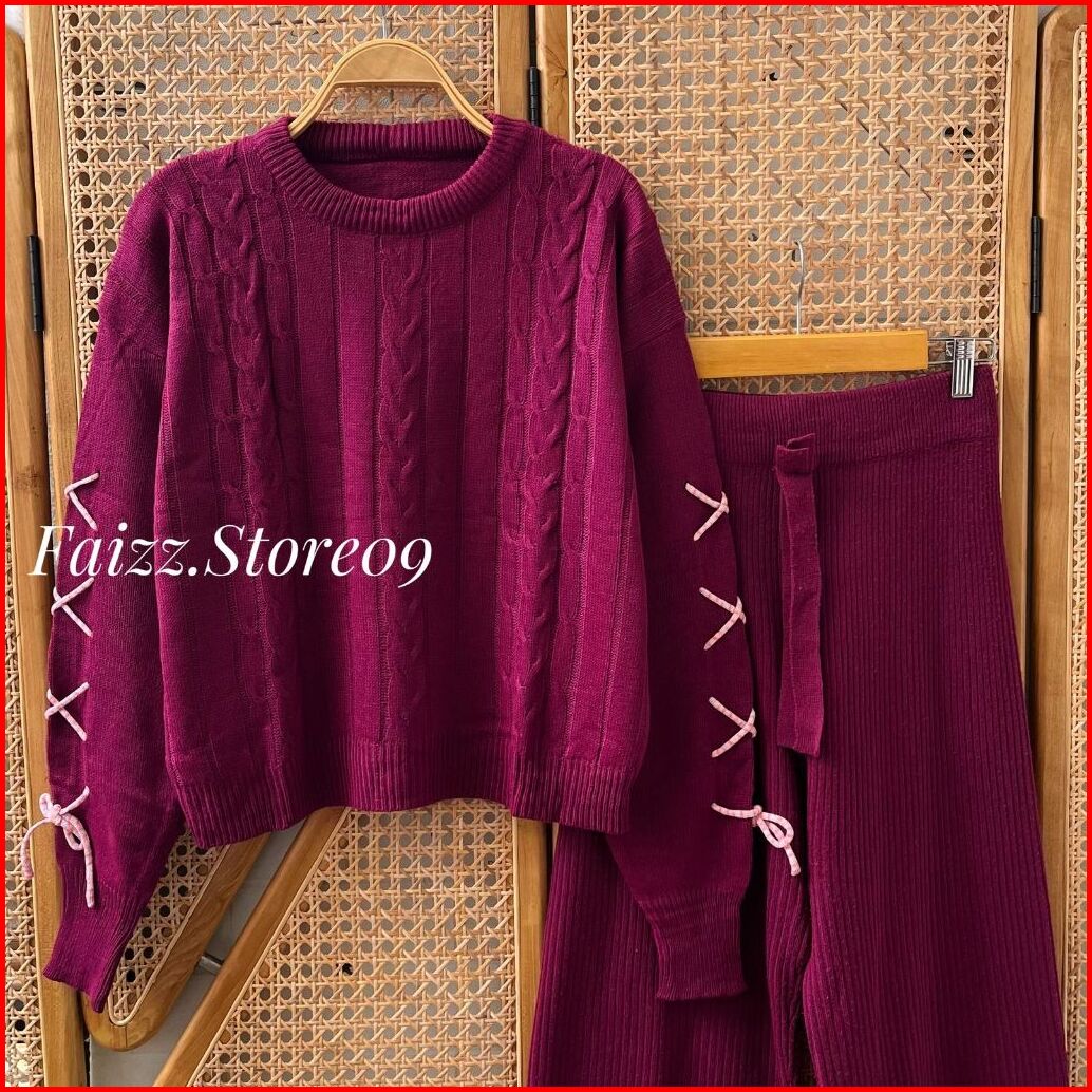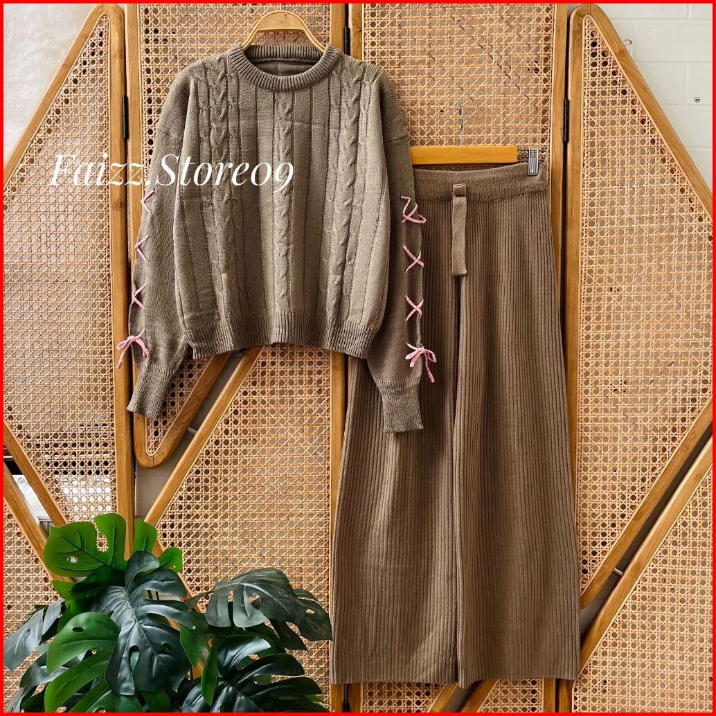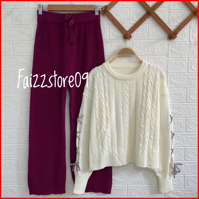 One Set Setelan Celana Kulot Monay Victoria Sweater Rajut Cable Strap Korea