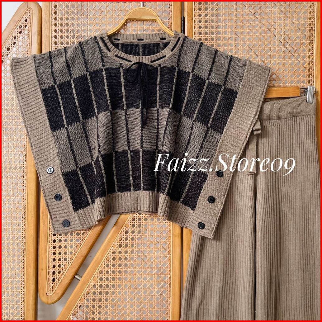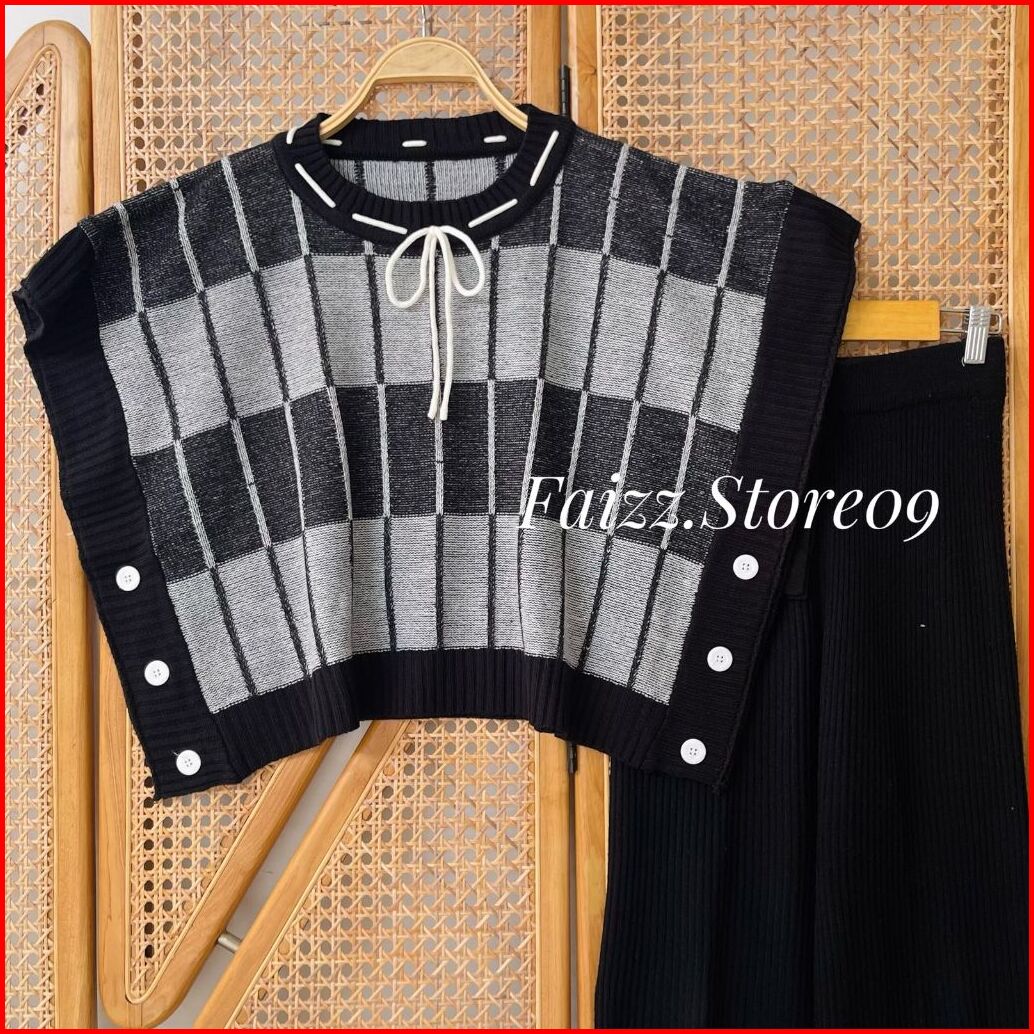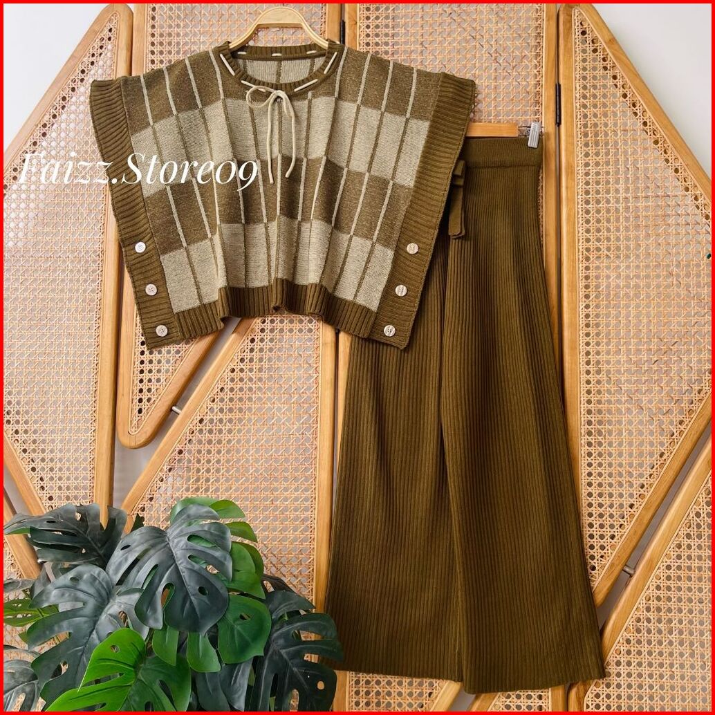 Oneset Nazilah Vest Rompi Rajut Kerah Bulat Motif Pita Setelan Celana Kulot Premium Wanita Kekinian