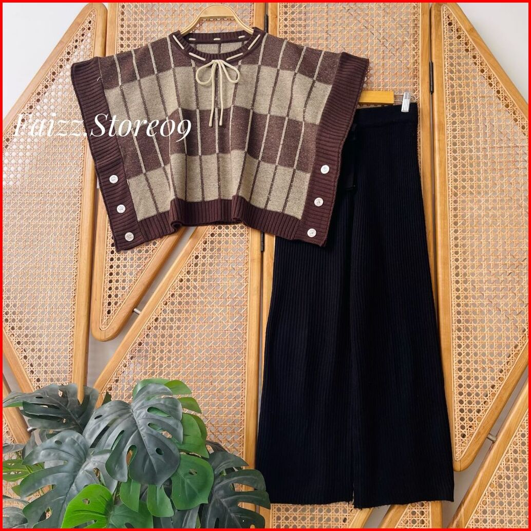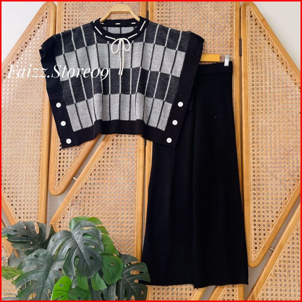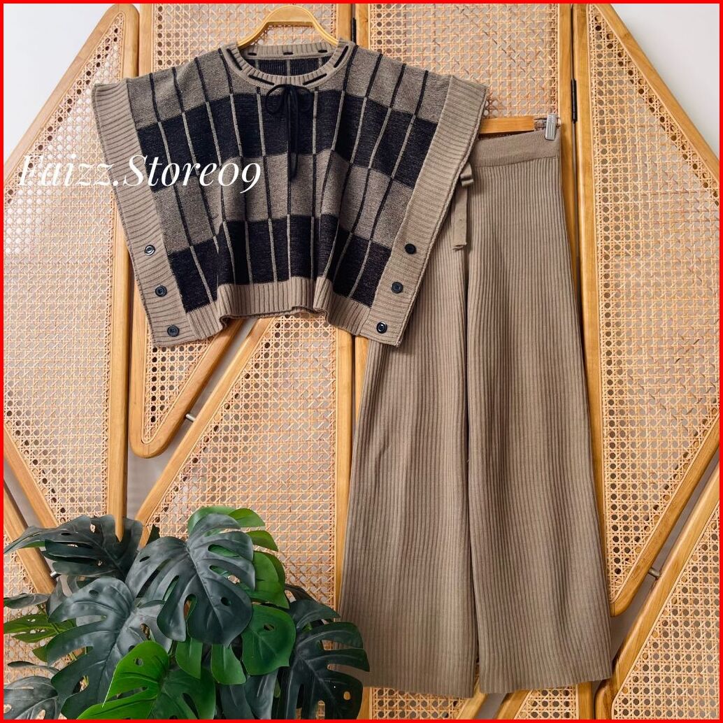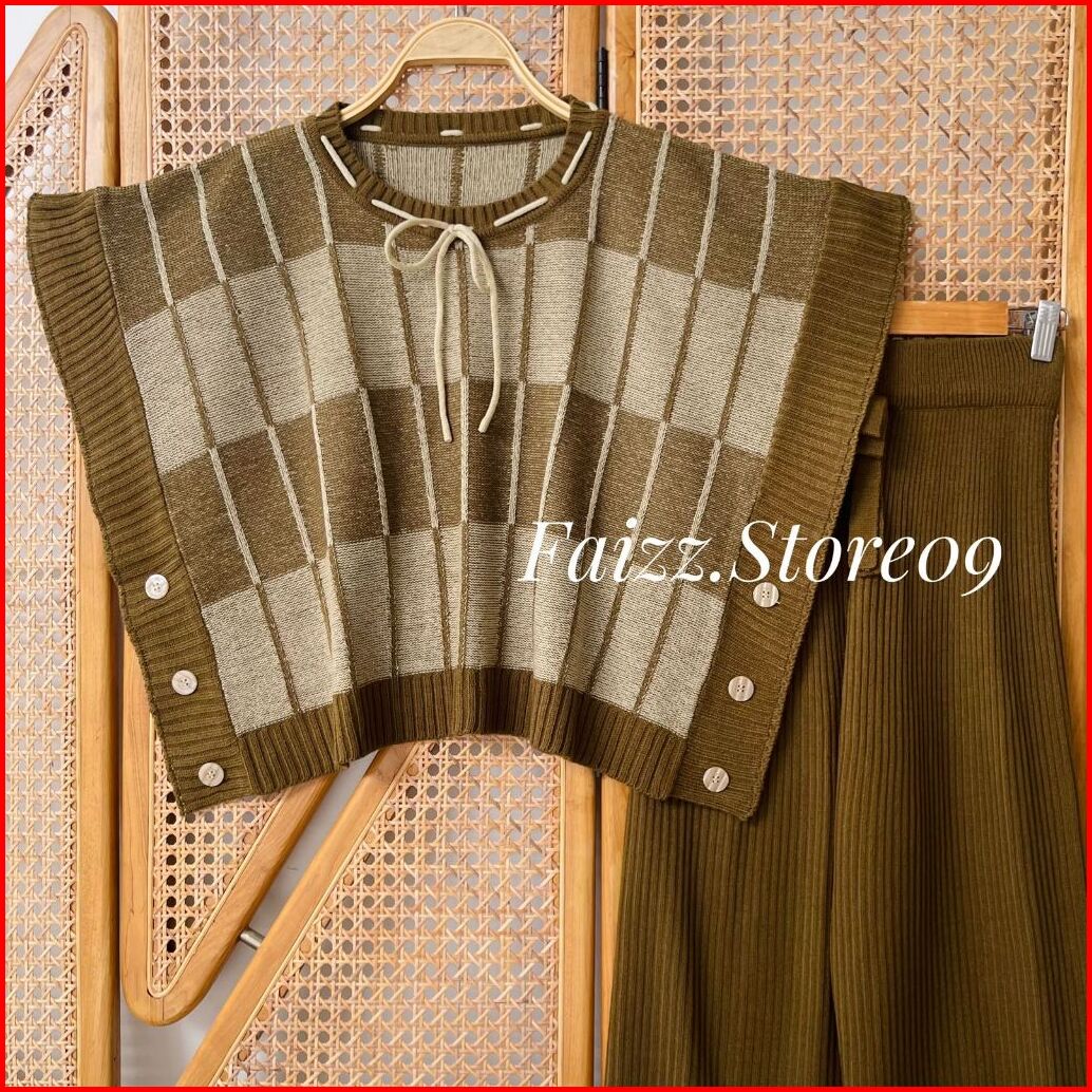 Oneset Nazilah Vest Rompi Rajut Kerah Bulat Motif Pita Setelan Celana Kulot Premium Wanita Kekinian