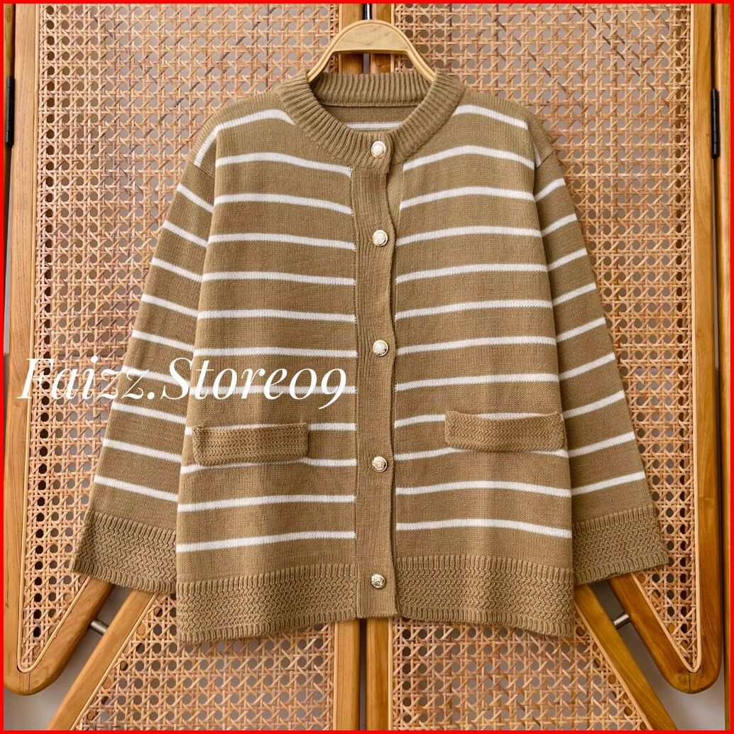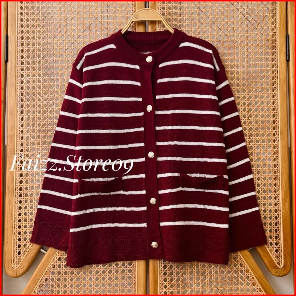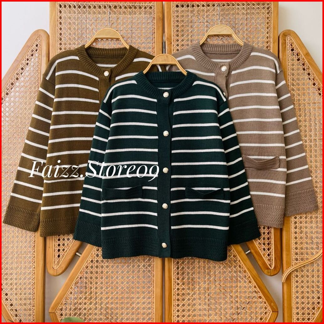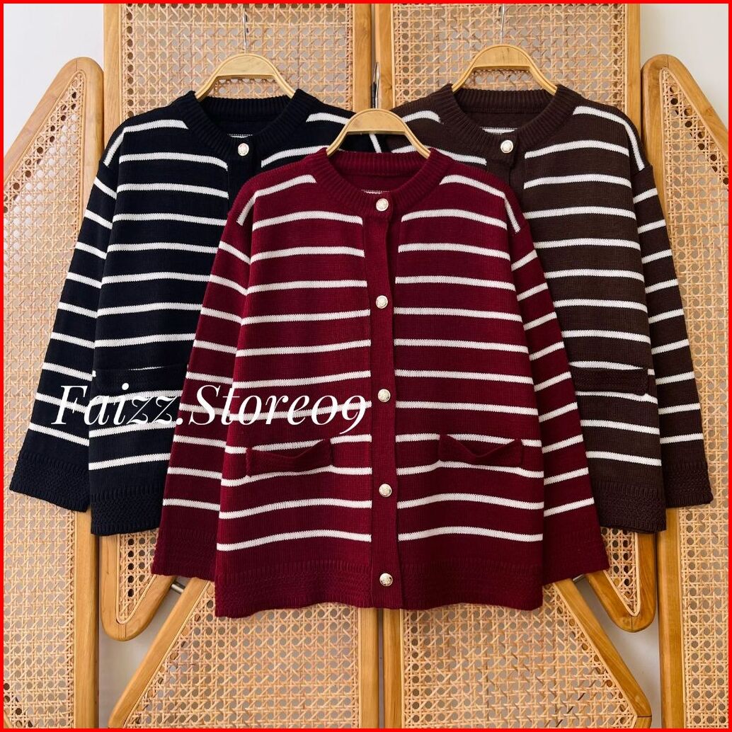 Maimun Cardy Knitwear - Outer Atasan Cardigan Rajut Wanita Kancing Motif Stripe Korean Style Premium