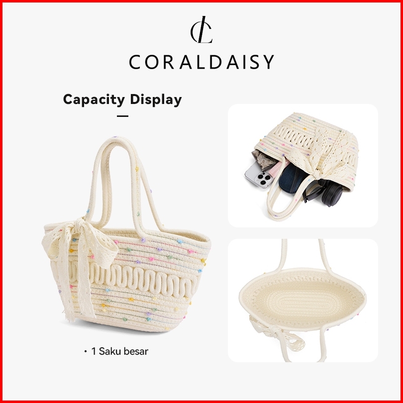 Coraldaisy Tas Wanita 2025 Terbaru Tas Anyaman Elegan Pita Handbag Cute Titik Pewarnaan Tas Tangan