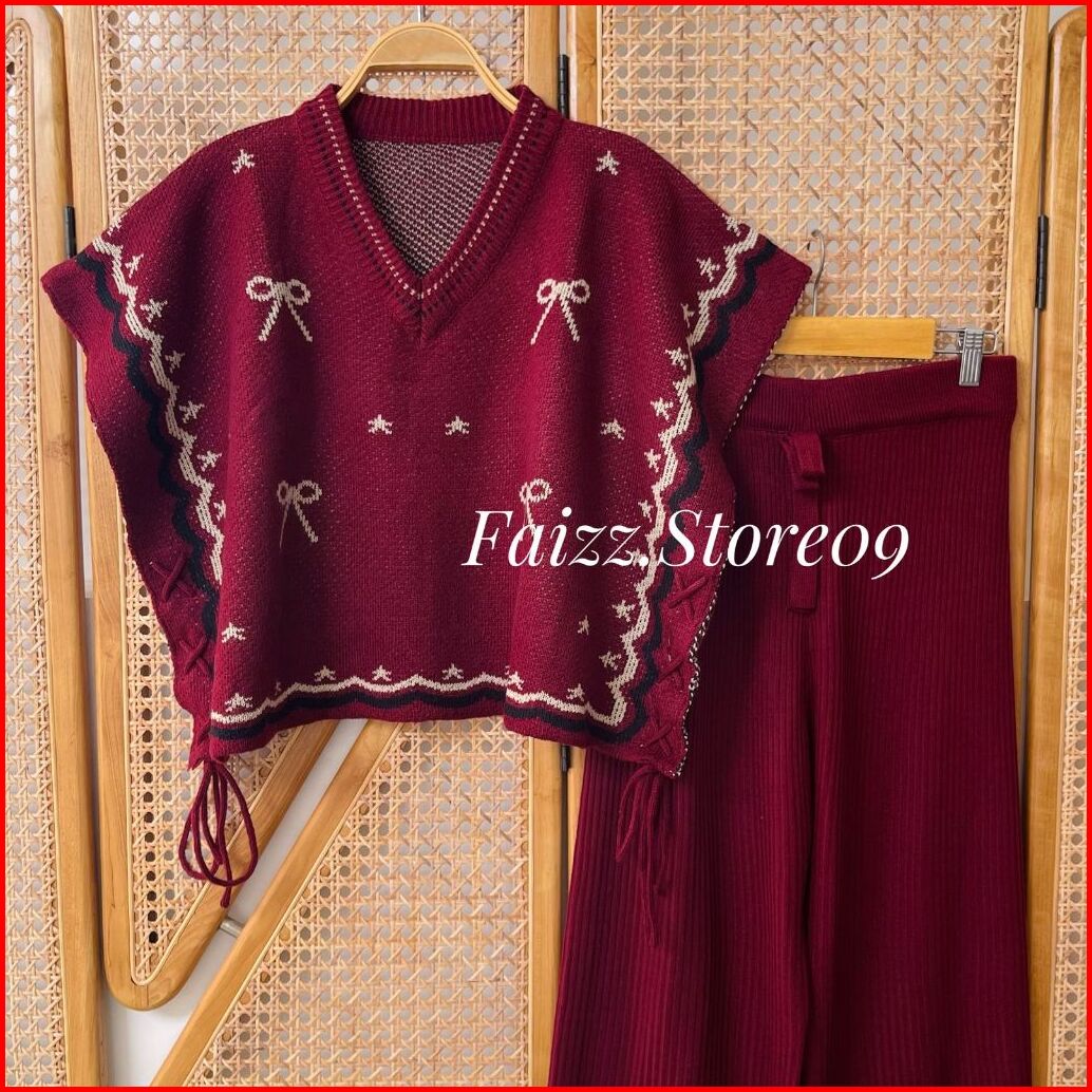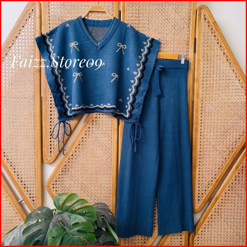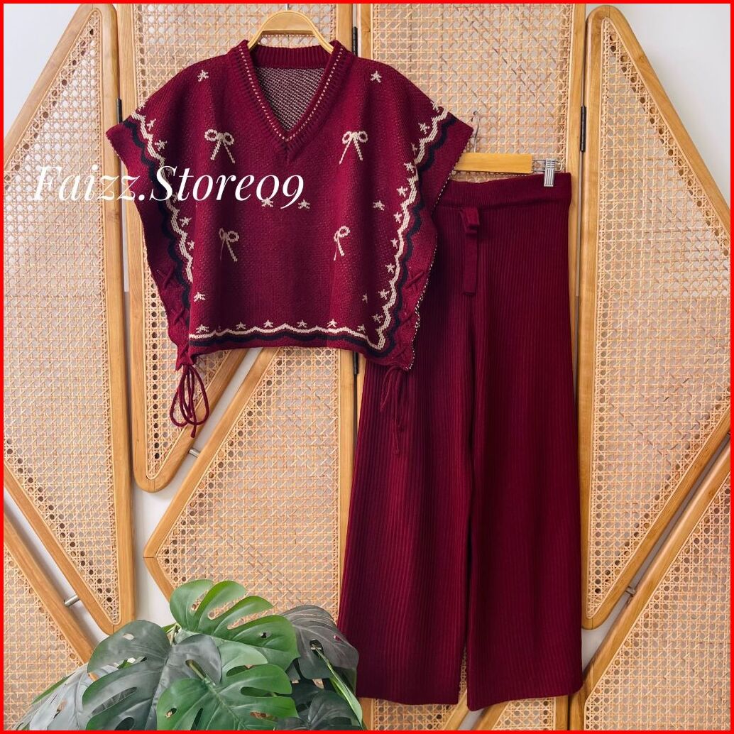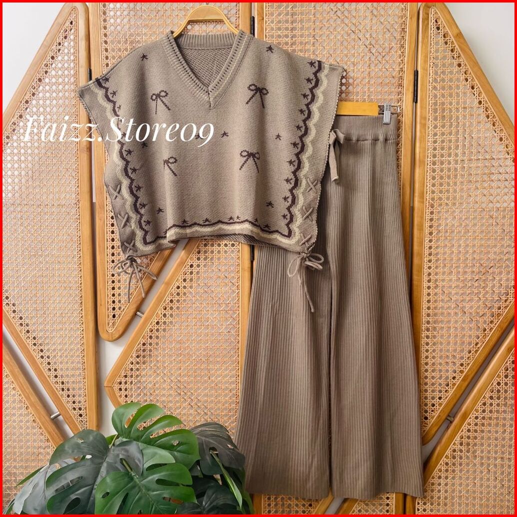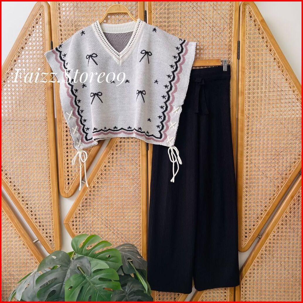 Oneset Ayundi Vest Rajut Wanita Kerah V Motif Pita Talikur Setelan Celana Kulot Premium Wanita Kekinian