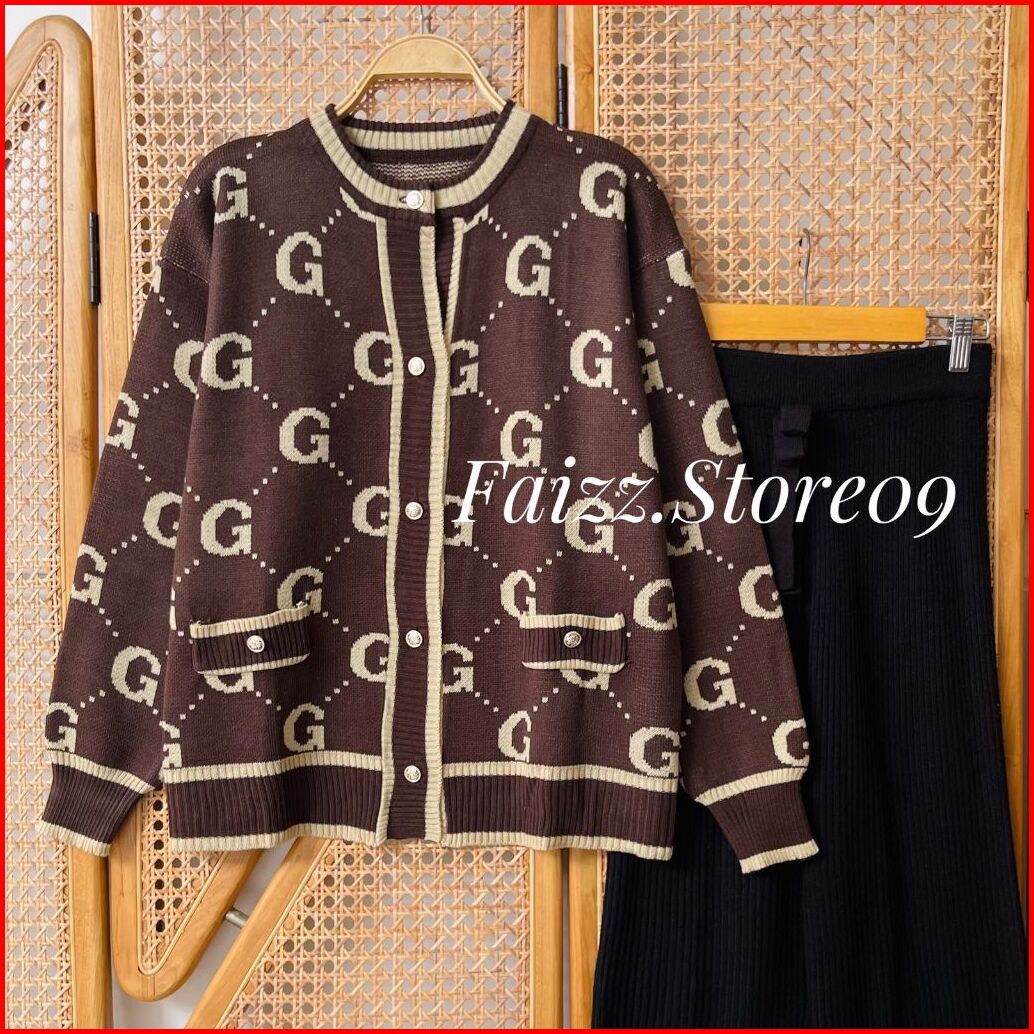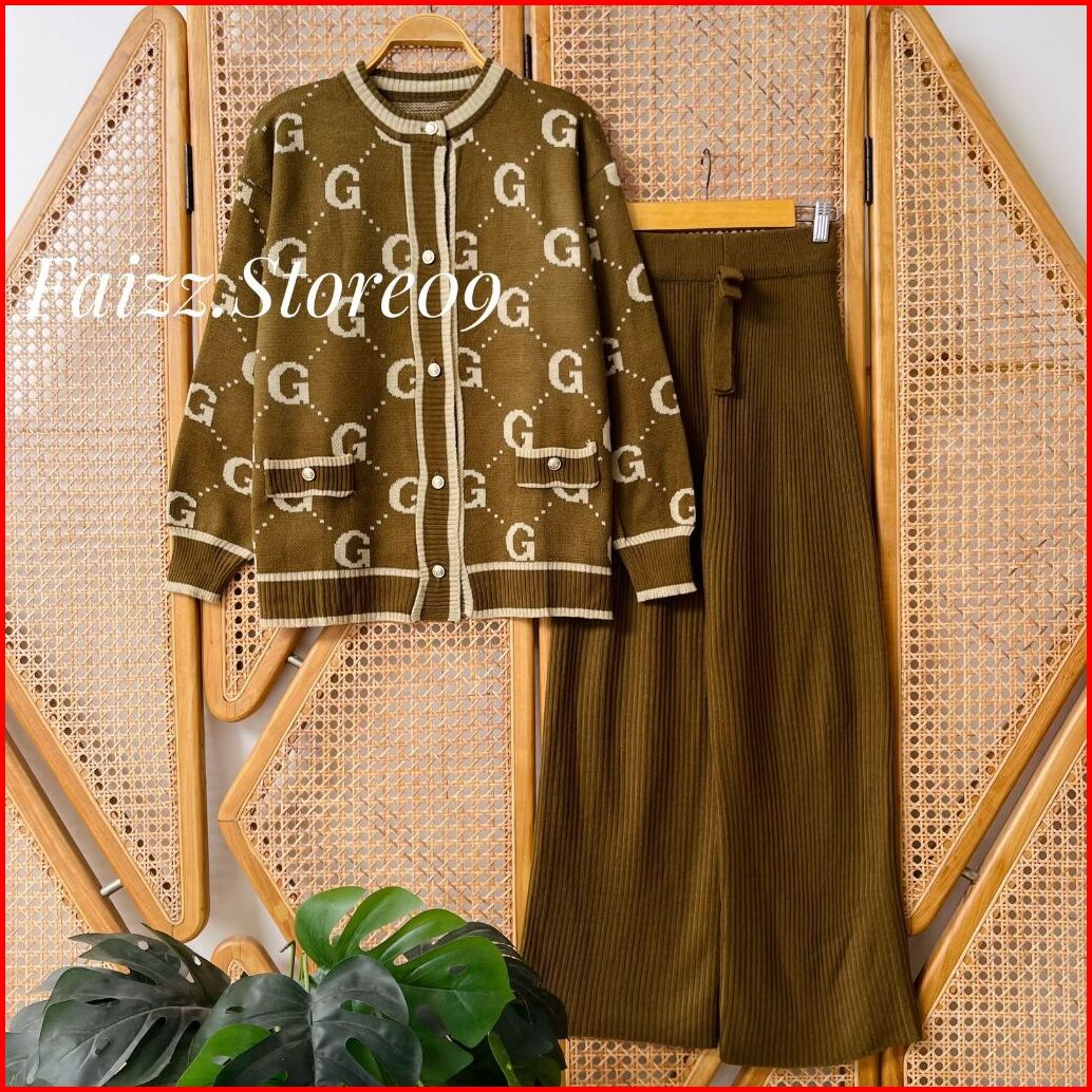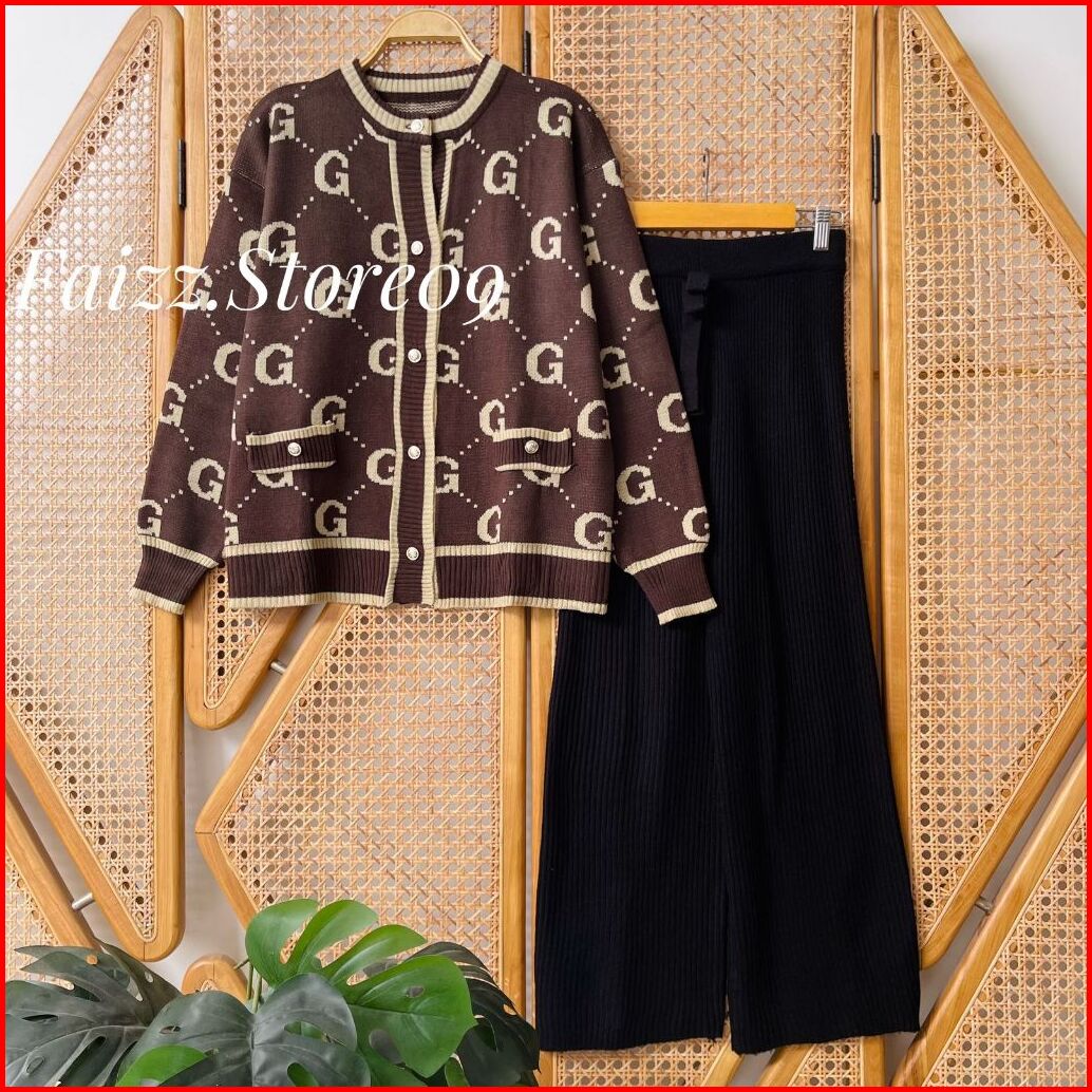 Oneset Atika Cardigan Rajut Kancing Motif Korean Setelan Celana Kulot Premium Wanita Lengan Panjang Kekinian