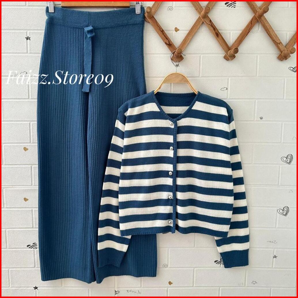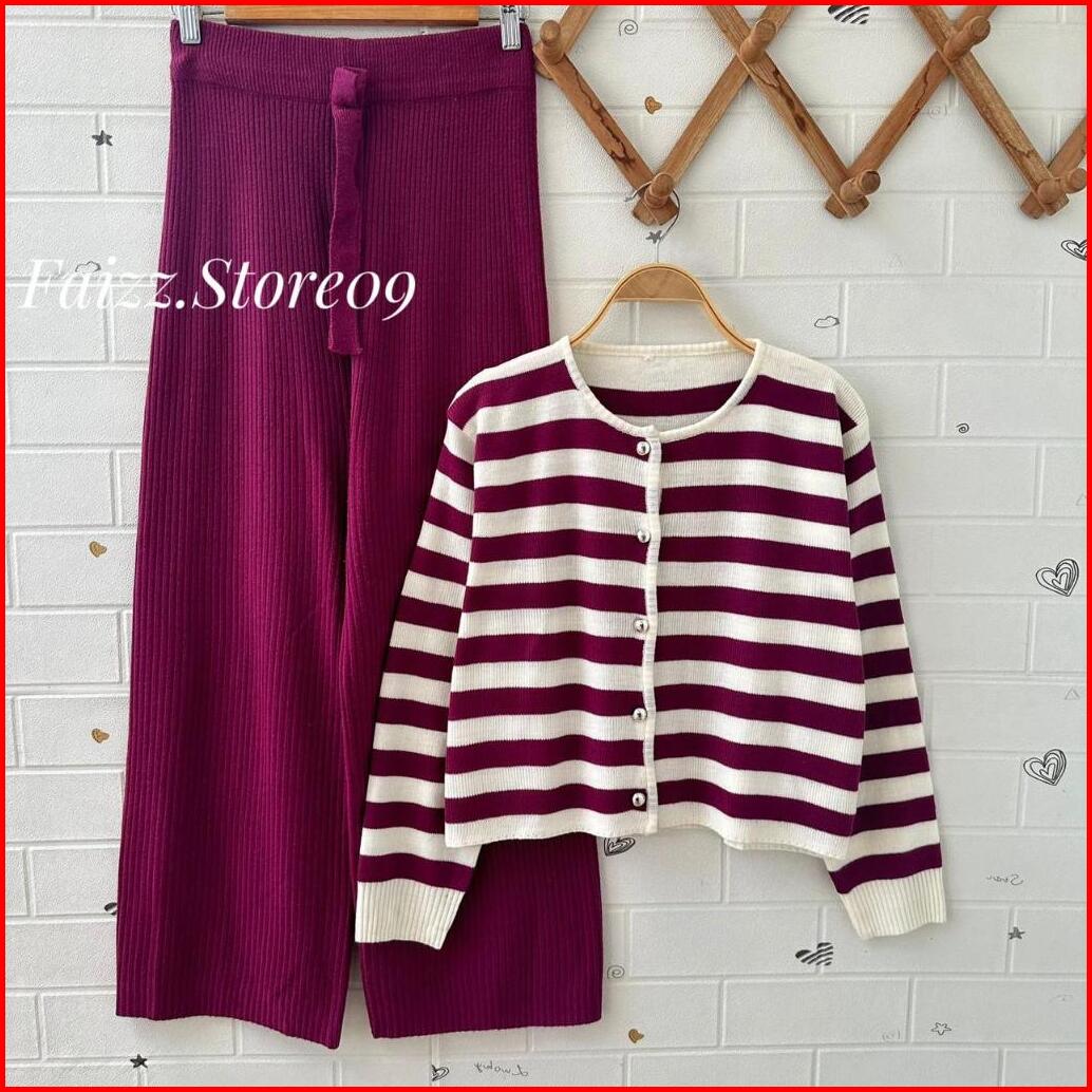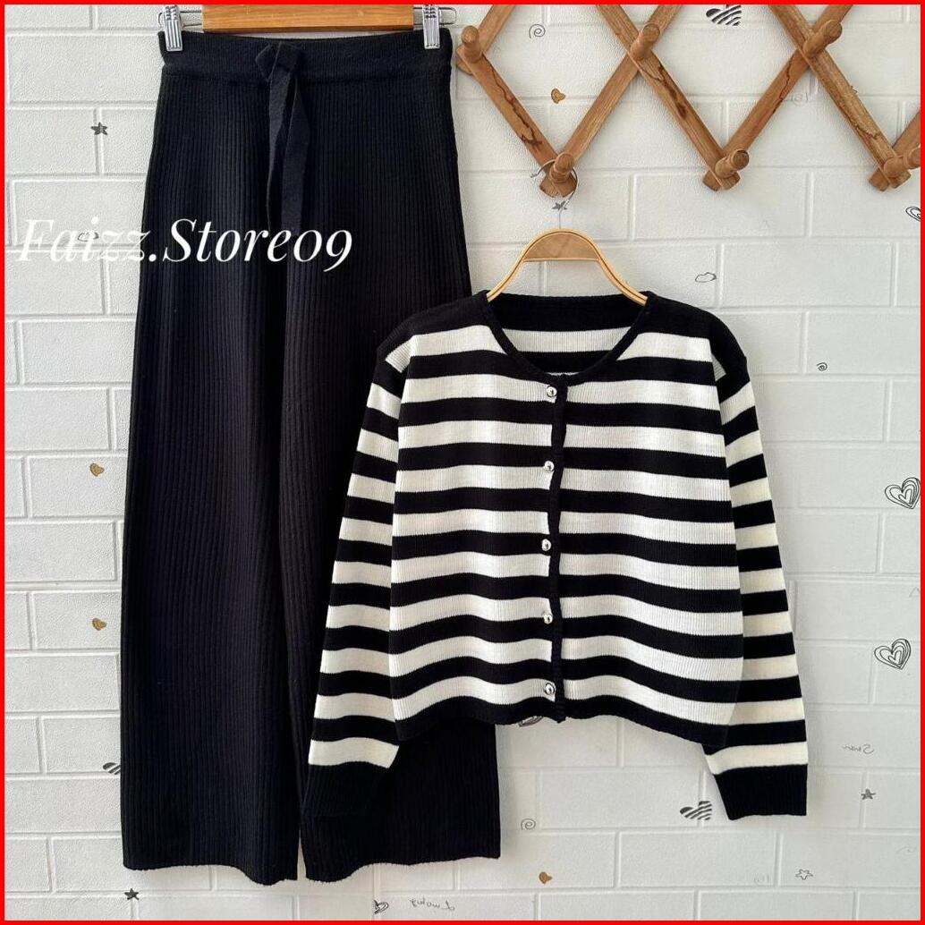 Oneset Cardigan Rajut Crop Sitala Stripe Lengan Panjang Setelan Celana Kulot Wanita Premium Kekinan