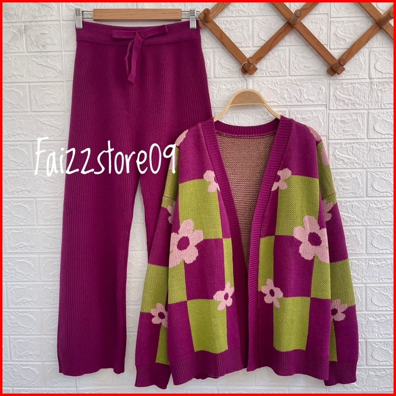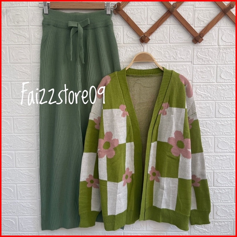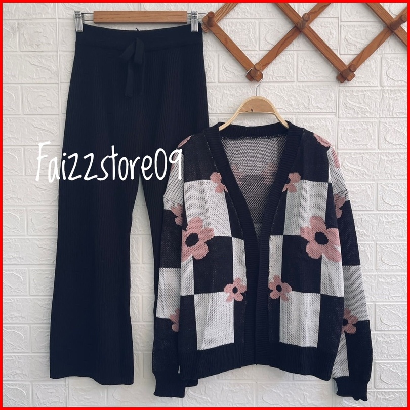 One Set Zafara Cardigan Rajut Oversize Wanita Motif Kotak Bunga Atasan Rajut Premium Wanita Murah