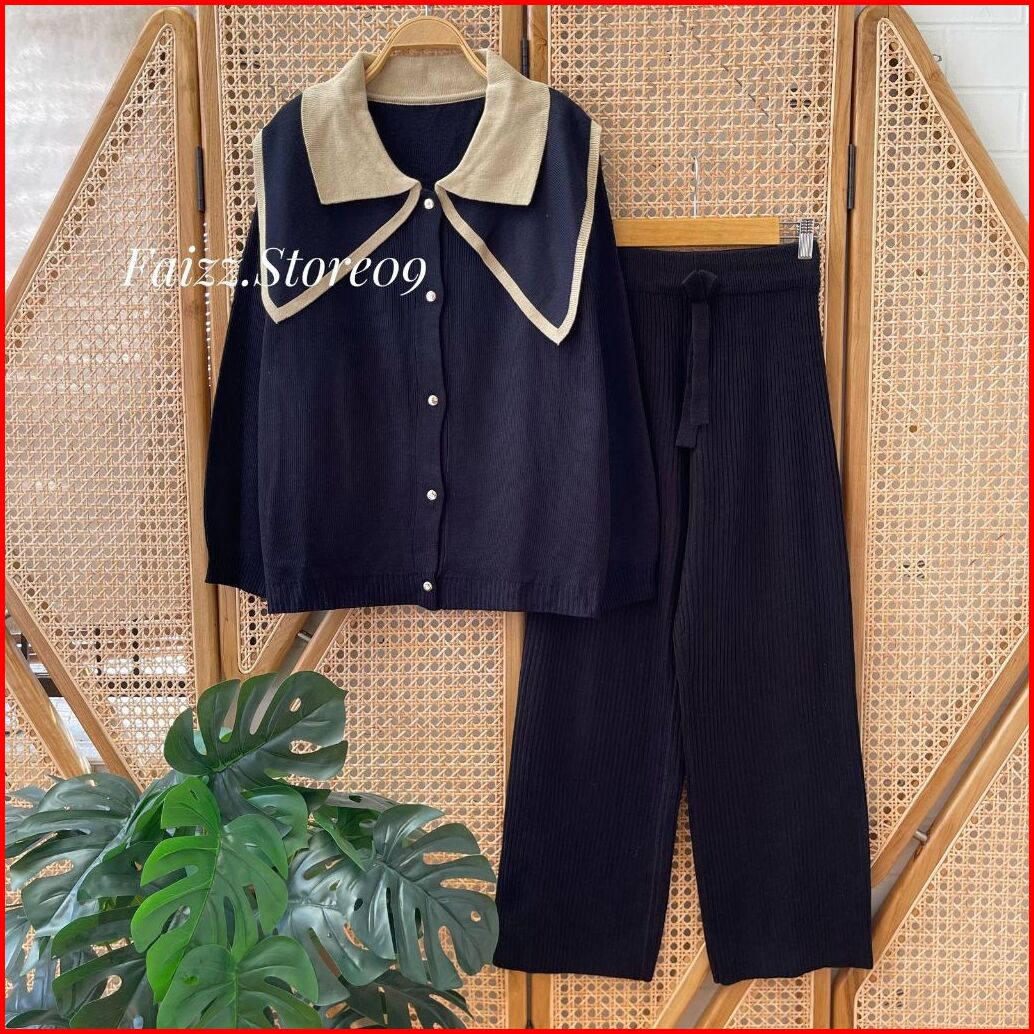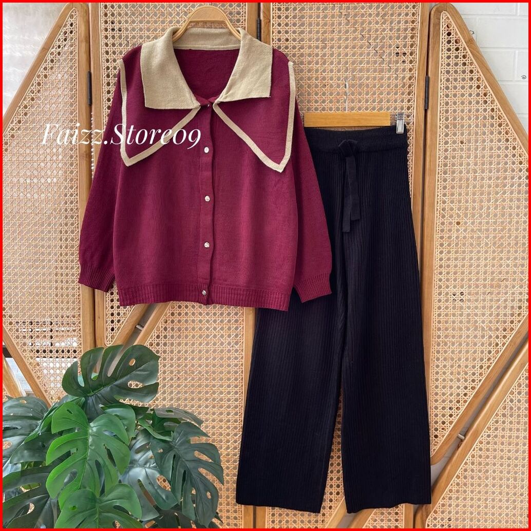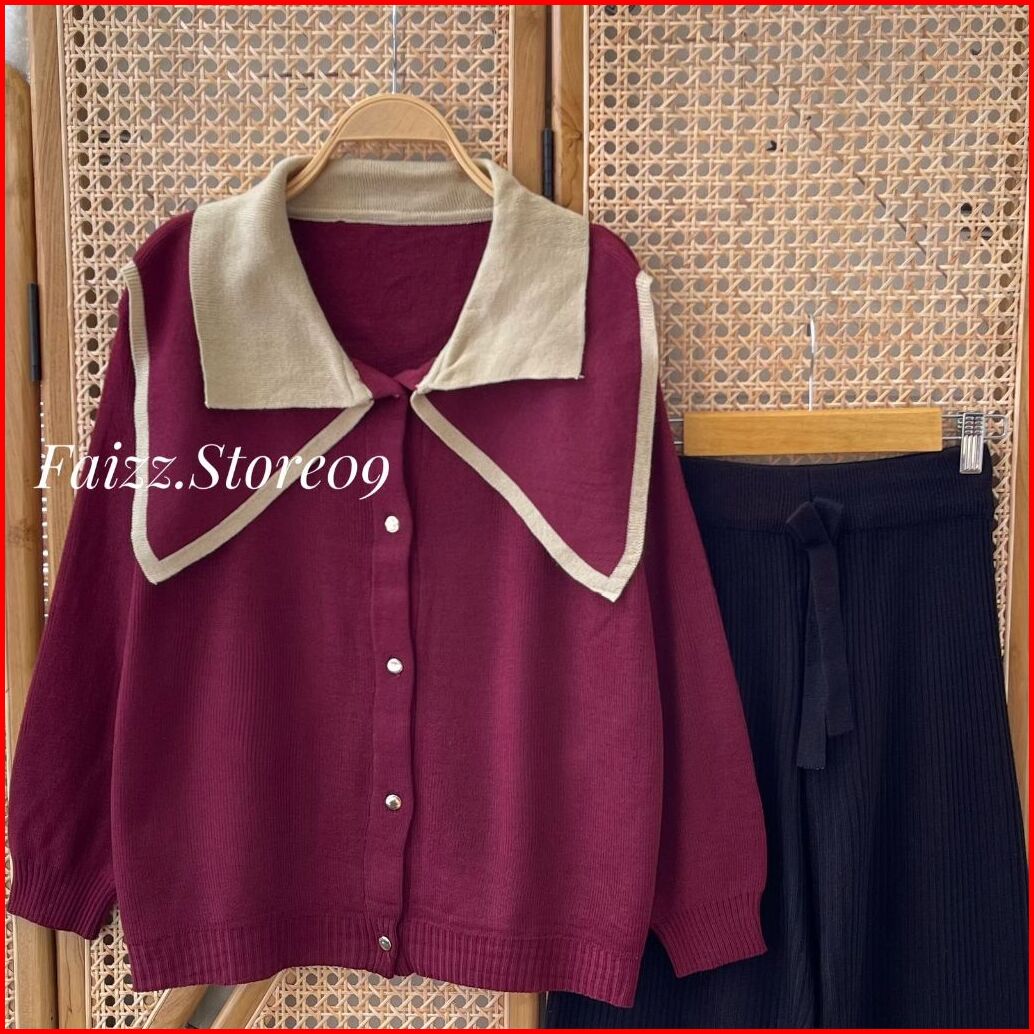 Oneset Betty Blouse Knits Polo Cardigan Setelan Celana Kulot Rajut Wanita Premium Kekinian Lengan Panjang