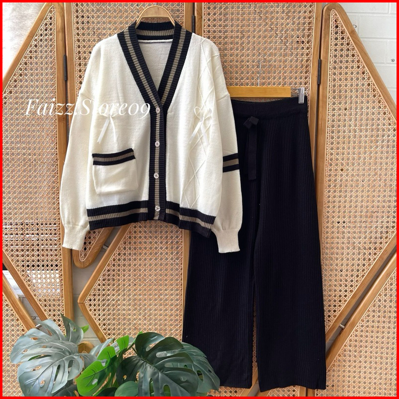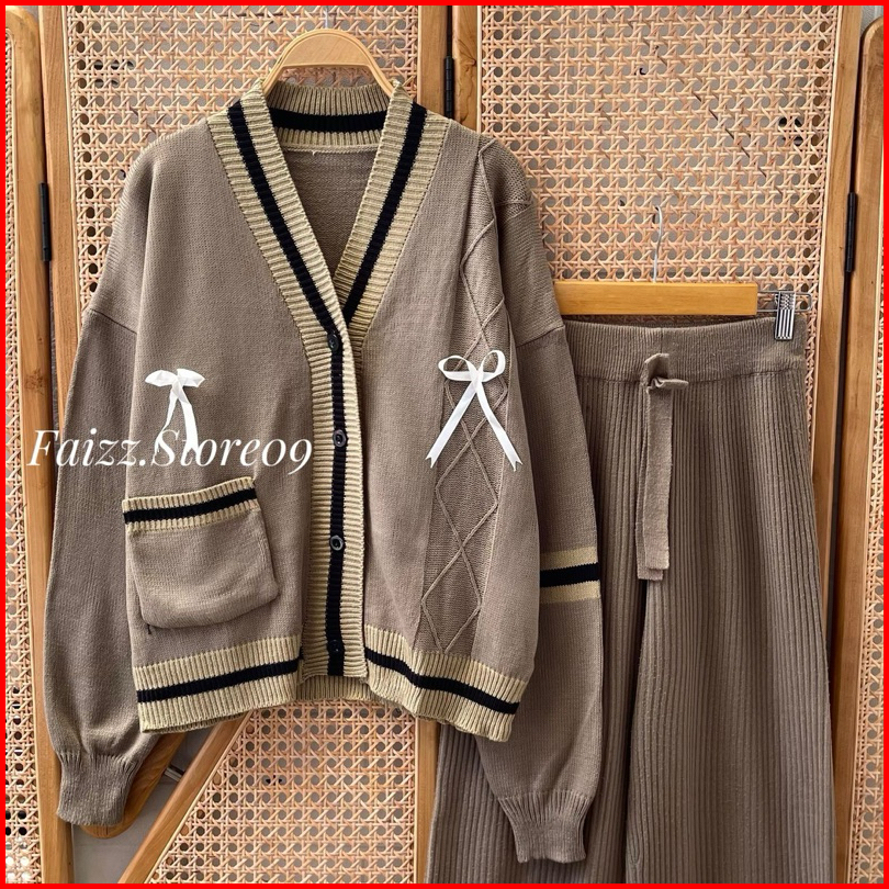 Oneset Lita Cardigan Rajut Kancing Motif Pita Setelan Celana Kulot Wanita Lengan Panjang Kekinian