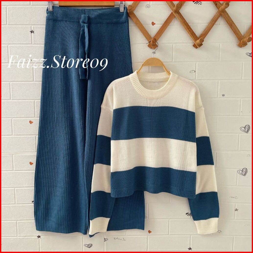 Oneset Sweater Rajut Yenni Crop Stripe Setelan Celana Kulot Premium Lengan Panjang Wanita Kekinian