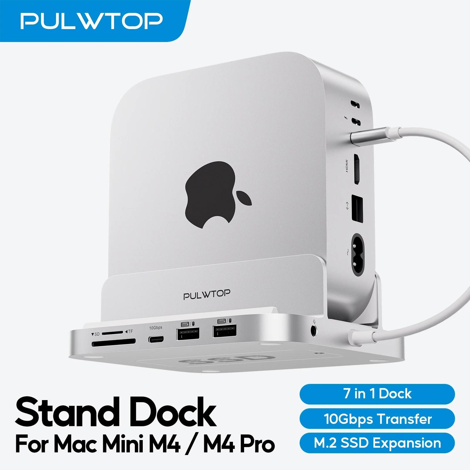 PULWTOP BS212C Apple Mac mini Hub for M4 with M.2 SSD Enclosure, 8-in-1 Vertical Mac mini Dock Stand with USB A/C 3.2 10