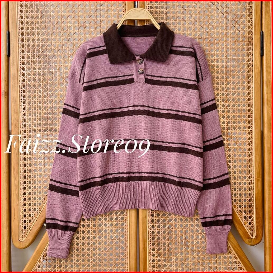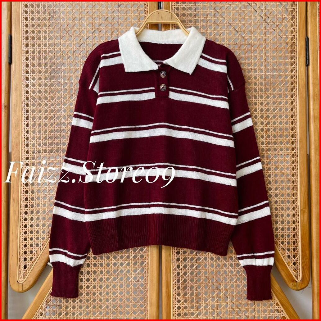 Pandoit Blouse Knit Kerah Polo Kancing - Atasan Sweater Rajut Wanita Motif Stripe Korean Style Premium