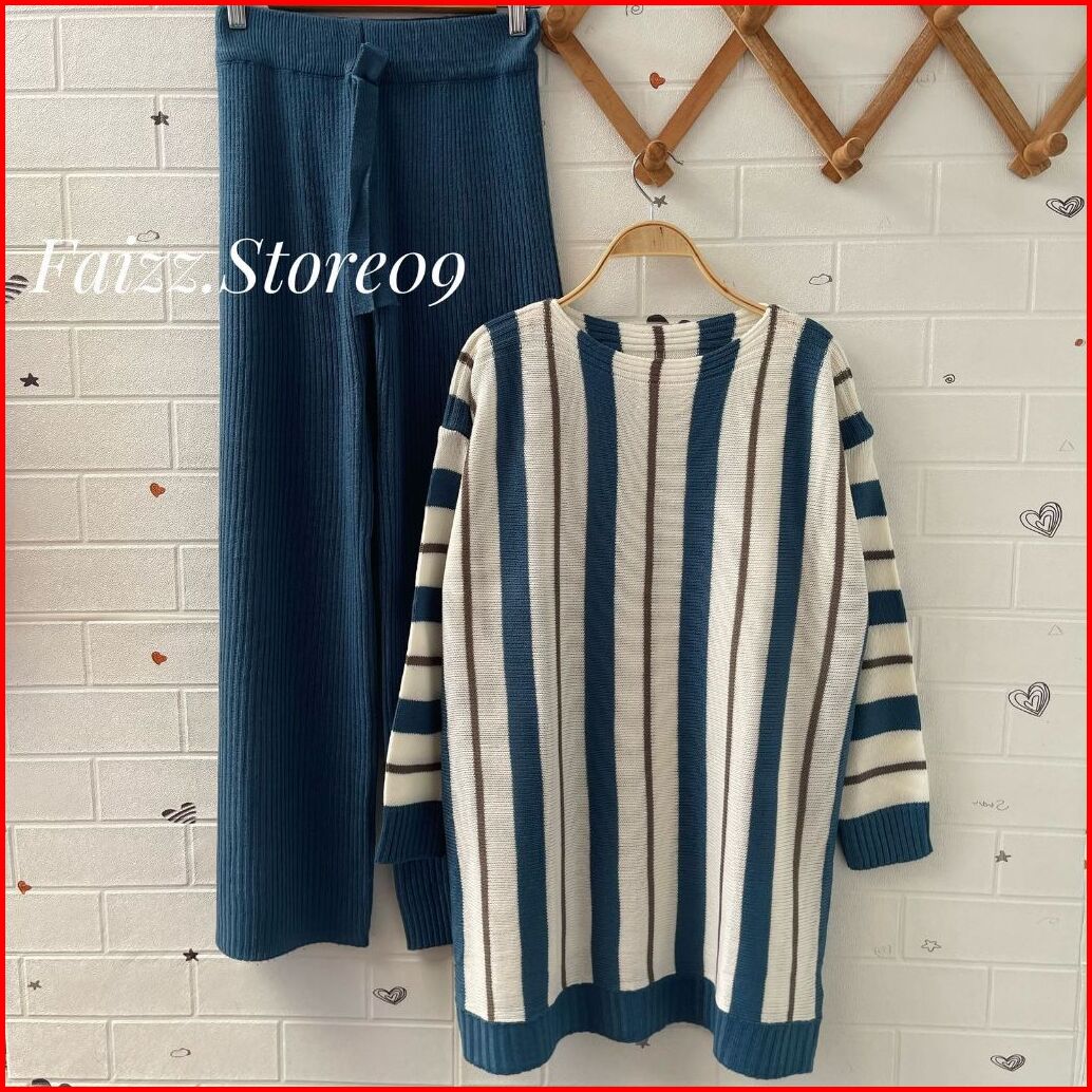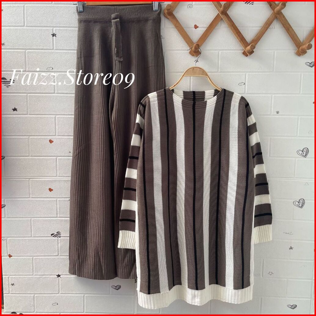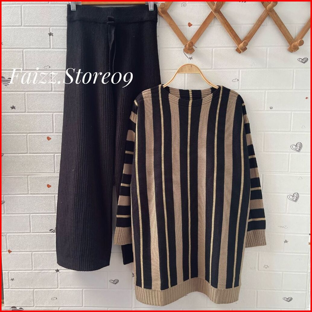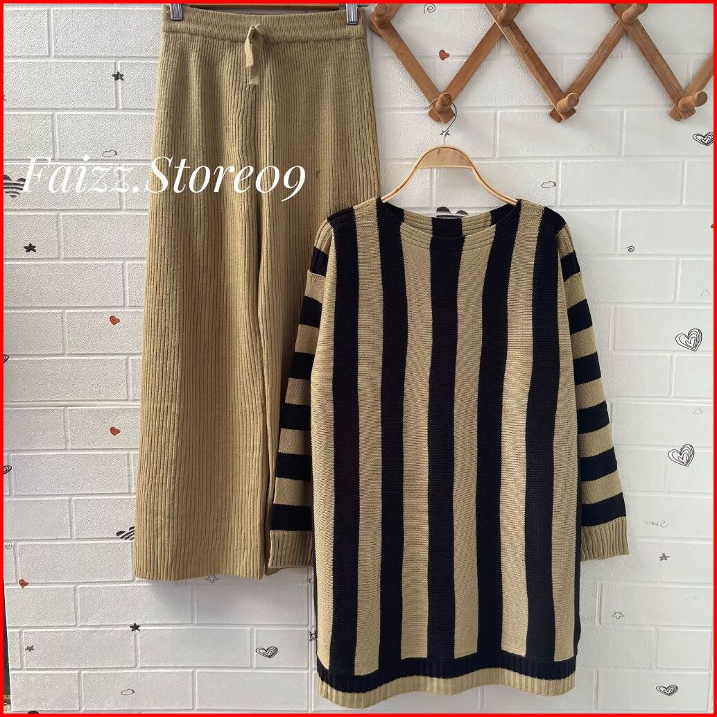 Oneset Top Knit Atasan Rajut Tangan Panjang Setelan Celana Kulot Rajut Wanita Premium