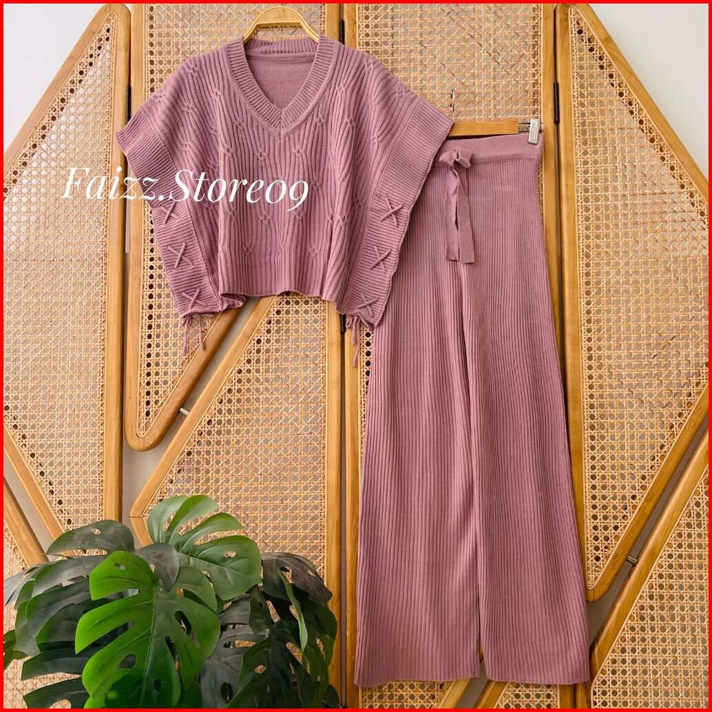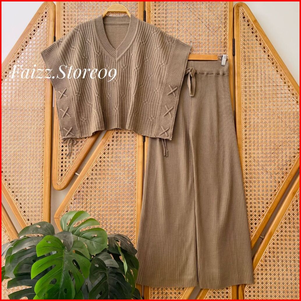 Oneset Rizqia Vest Rompi Rajut Kerah V-neck Setelan Celana Kulot Premium Wanita Kekinian