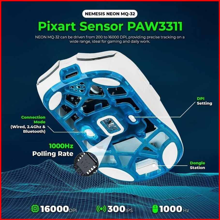 Nyk Nemesis Neon Mq32 Mq-32 Gaming Mouse Lightweight Paw3311 Wireless 2.4ghz Tri-mode Connection