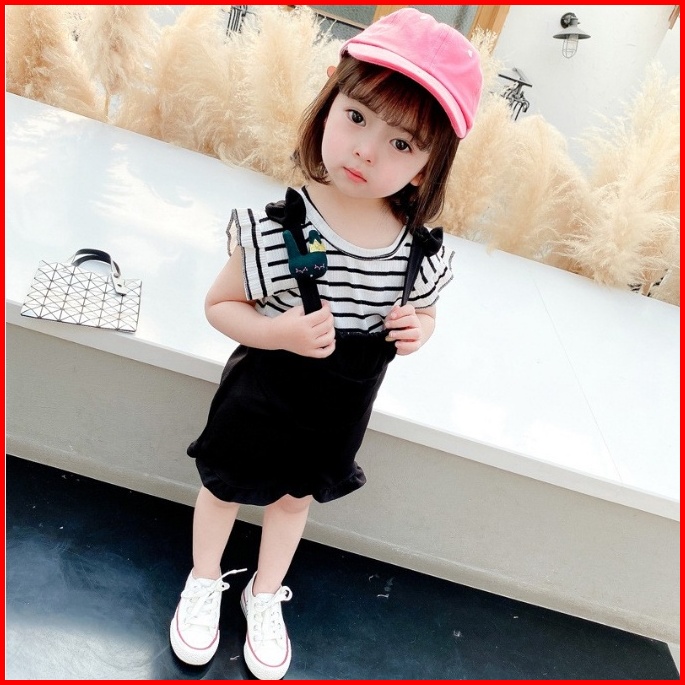 Setelan Set 2in1 Overall Anak Bayi Perempuan Kodok Garis Strip Pendek Import Cewek