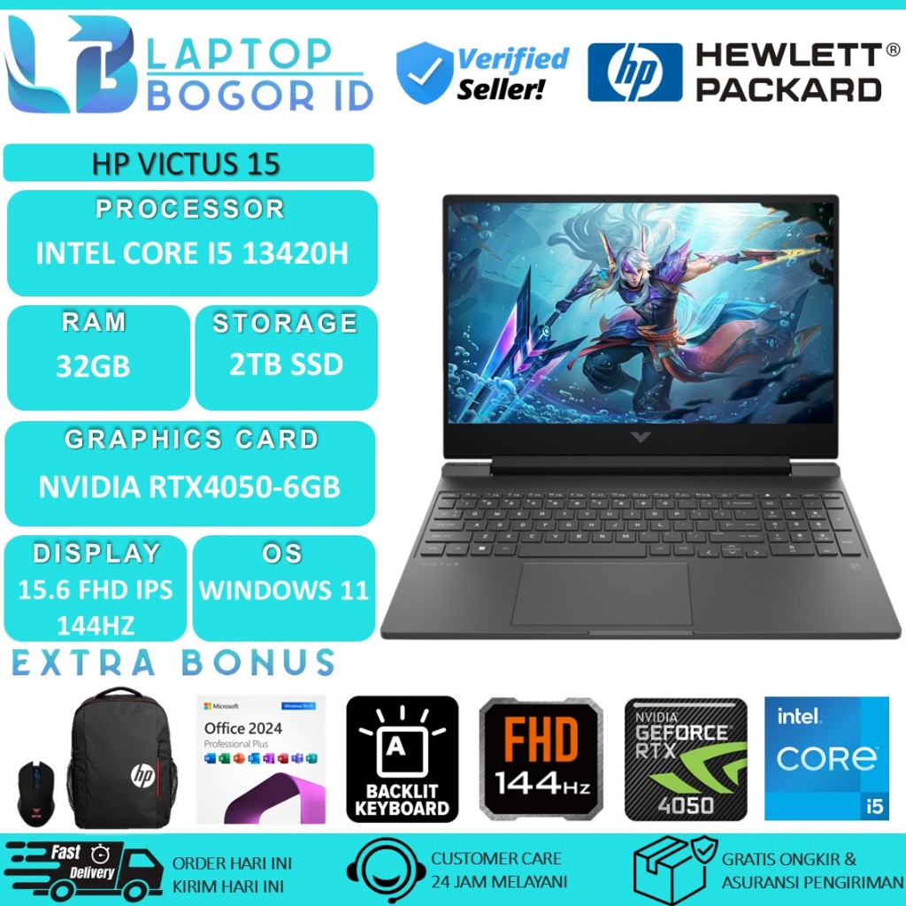 Laptop Gaming HP Victus 15 Intel Core i5 13420H Ram 32GB 2TB SSD FHD IPS RTX4050 144Hz Windows 11
