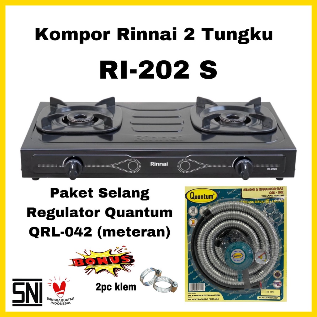 Paket Kompor Gas Rinnai 2 Tungku RI-202S Bonus Selang Regulator Gas Quantum QRL-042/QRL142/RI-202 S