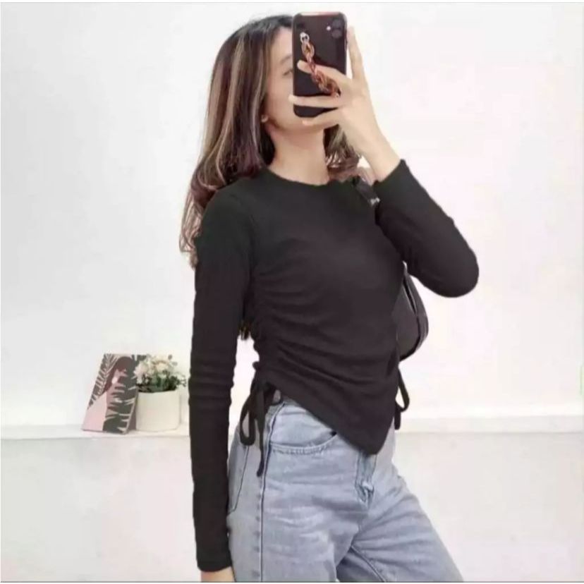 Crop Top Serut Samping Kiri & Kanan Lengan Panjang Atasan Knit Blouse Kerut Tali Korea Style