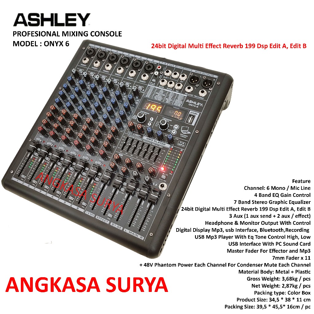Mixer ASHLEY ONYX 6 ORIGINAL / Mixer Audio 6 Channel Ashley ONYX6 Effect Reverb 199 Dsp Edit A, Edit B