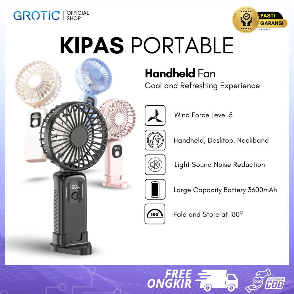 GROTIC Kipas Angin Mini Portable 3in1 Model Lipat & Genggam LED Display 5 Kecepatan 3600mAh Rechargeable