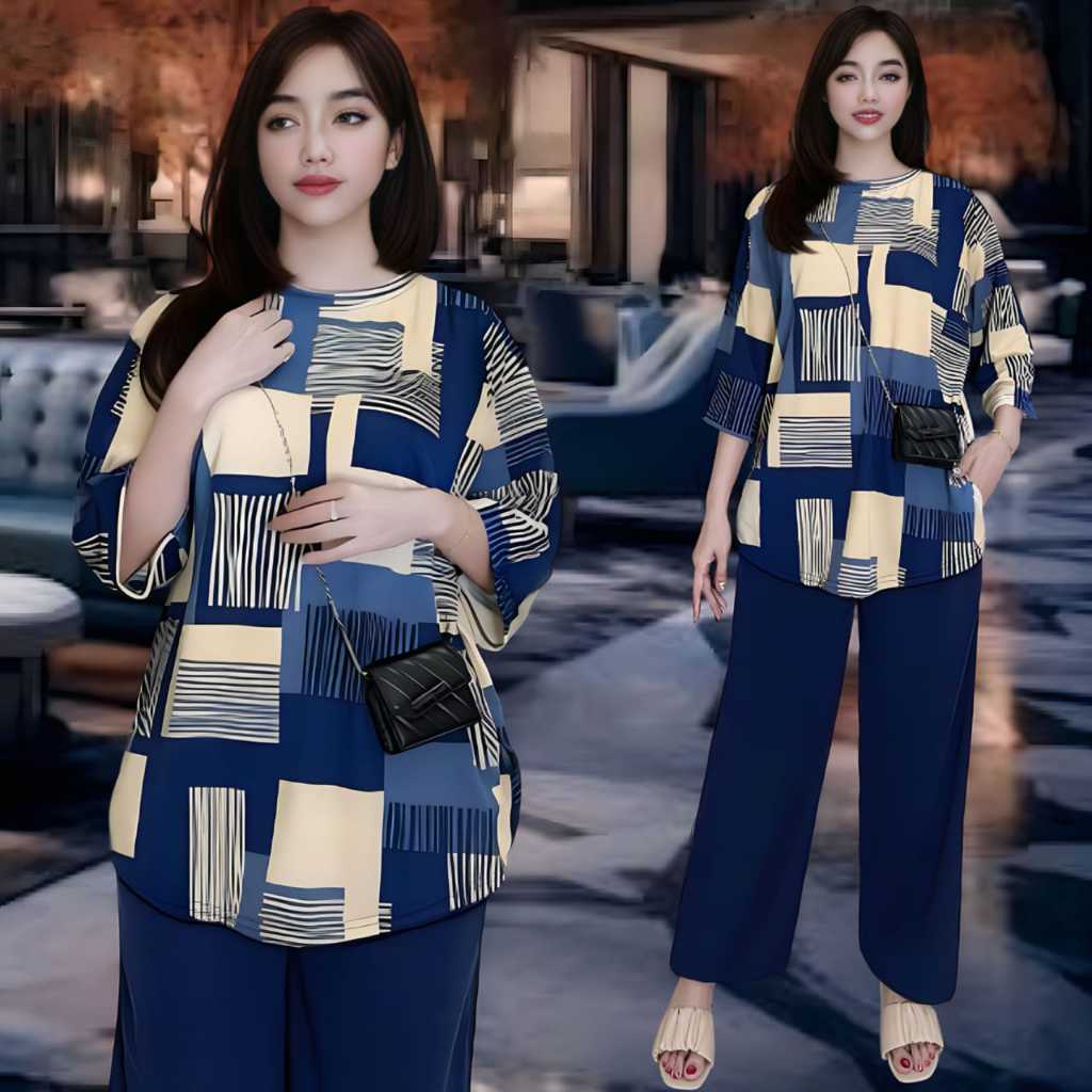 SAFA SETELAN WANITA LD 120 & LD 130 CELANA LURUS DAN ATASAN OVAL BELAHAN KIRI DAN KANAN OVERSIZE WANITA celana lurus karet kantor kaos santai Motif