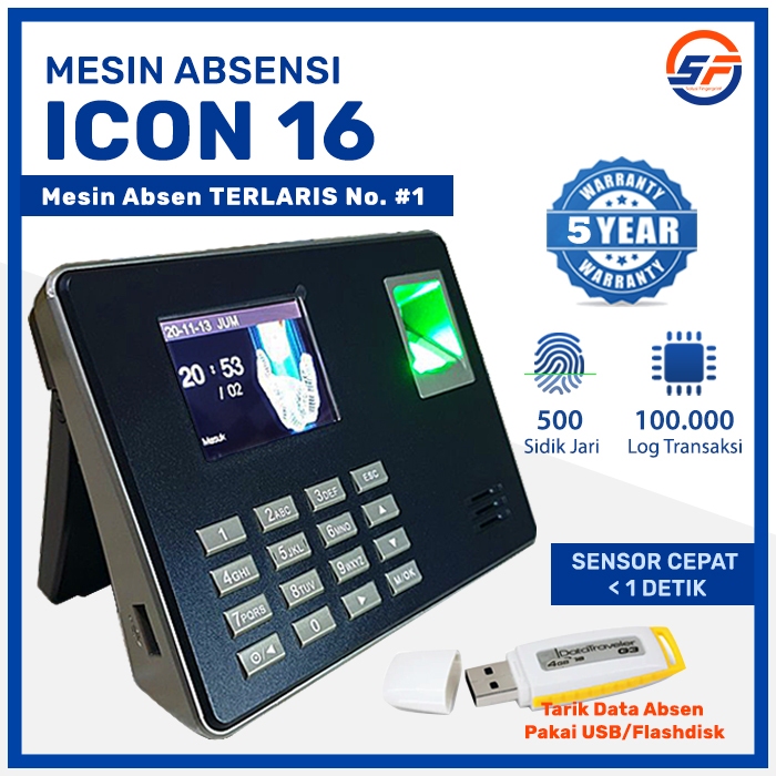 Mesin Absensi Sidik Jari 100.000 Kapasitas ICON 16 Fingerprint Bahasa Indonesia Laporan Otomatis