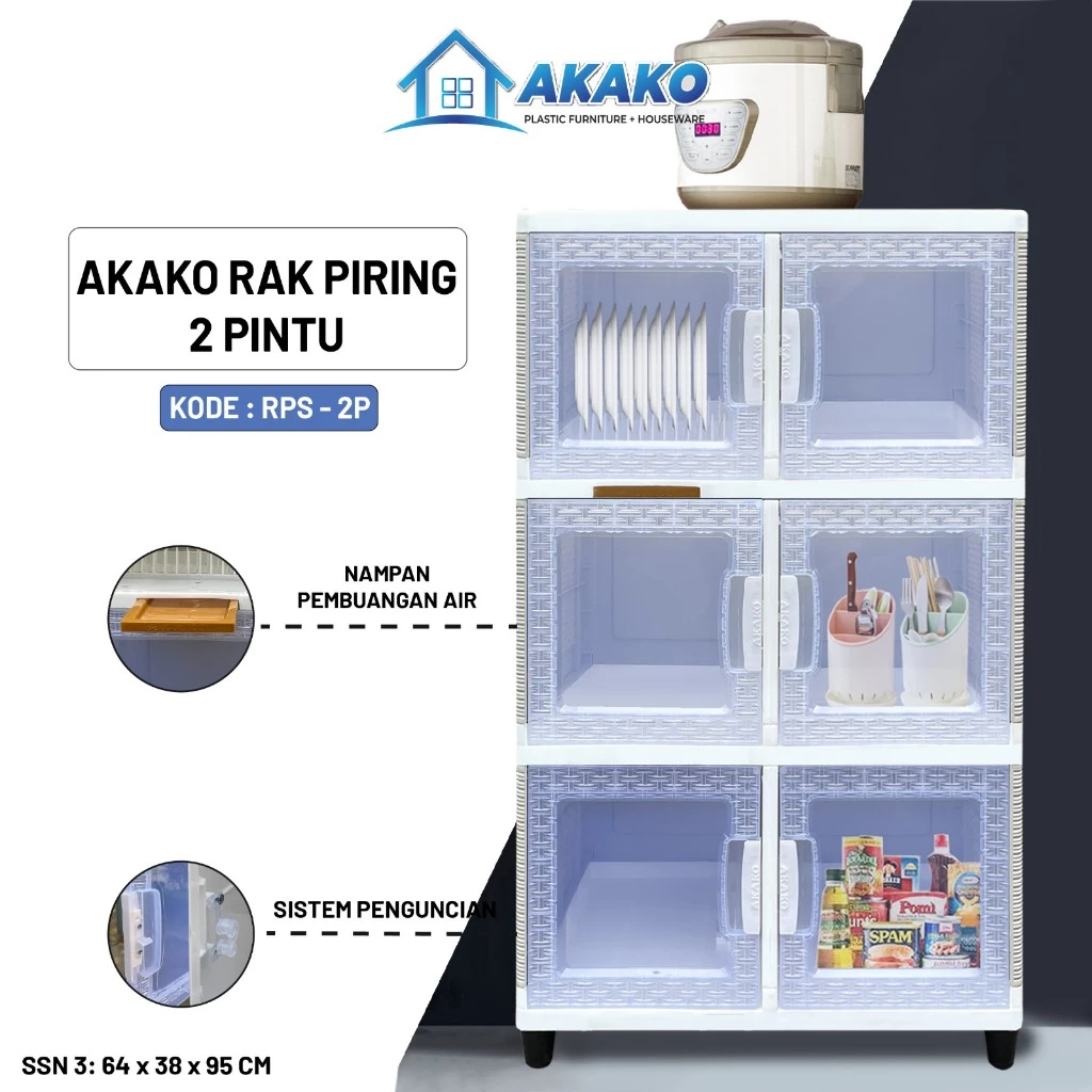 AKAKO - Lemari Rak Piring Plastik 2 Pintu + Nampan + Kaca Transparan Susun 3, 4, dan 5