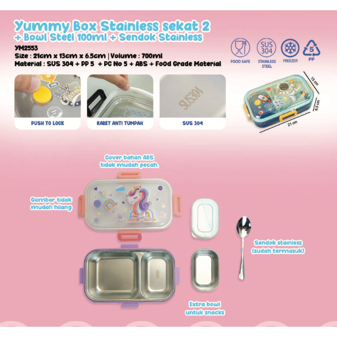 Yummy Bento Box Sekat 2 Stainless 700ml Anti-Tumpah