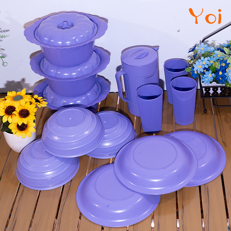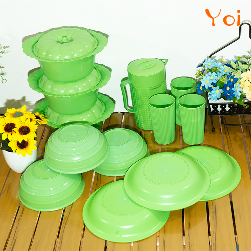 Yoi - (13 Pcs) Set Peralatan Makan Plastik / Set Piring, Mangkuk, Teko, dan Gelas / Cocok untuk Acara Makan Bulat yang Spesial / Basi Bulat