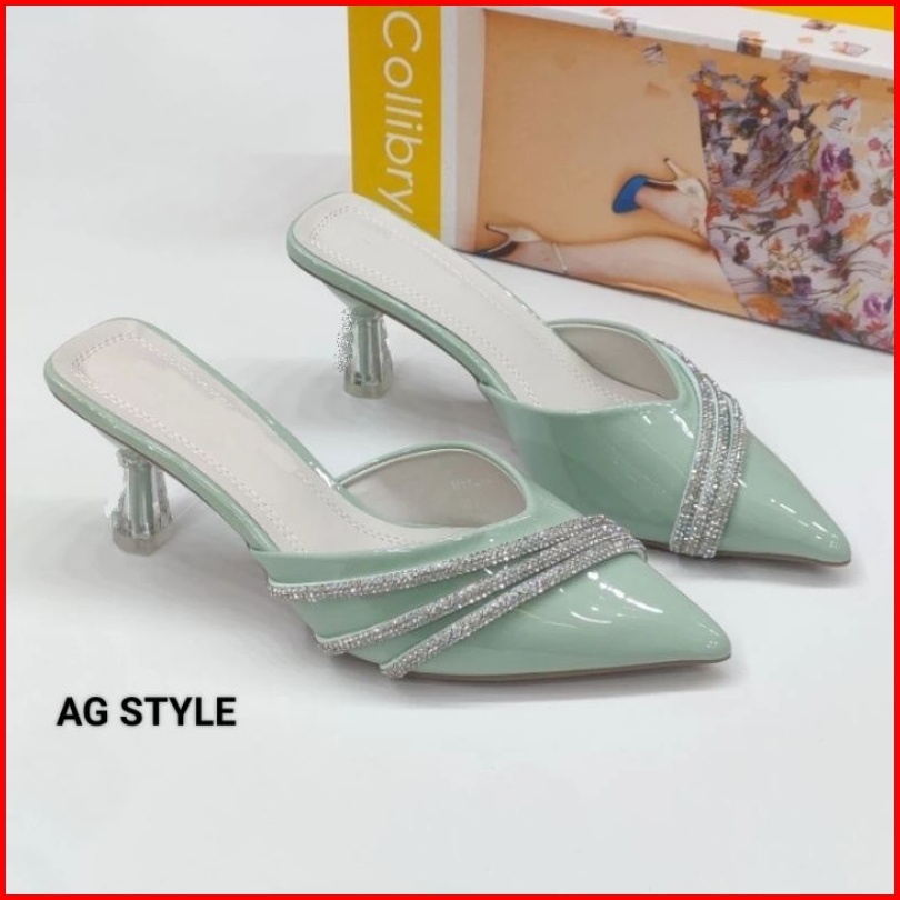 Sandal Heels Kaca Wanita Hak Kerucut Bapau Lancip Mutiara Diamond Strip Import Termurah Terbaru High Heel Pesta Kondanga